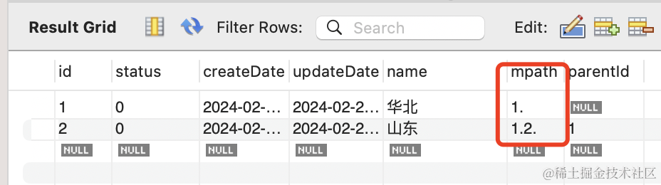 }可以看到,它通过 mpath 路径存储了当前节点的访问路径,从而实现了父子关系的记录: