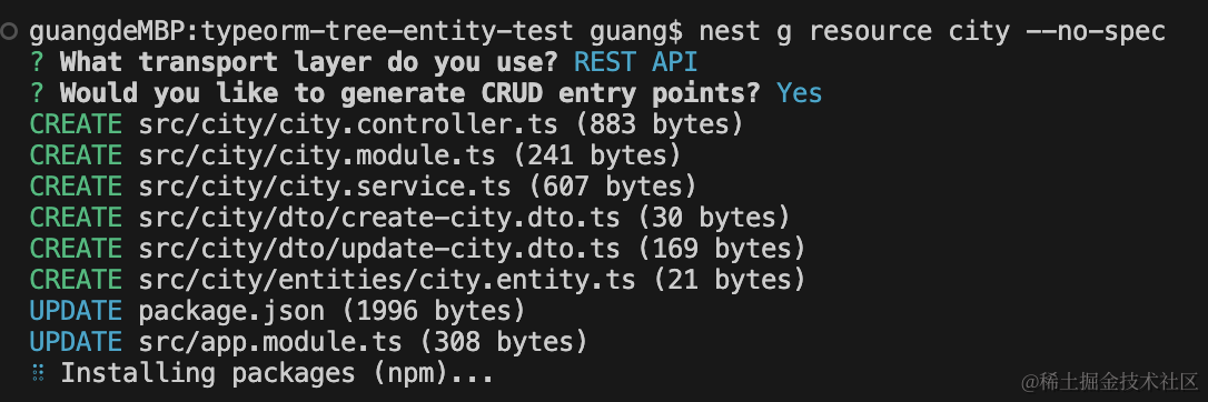 nest g resource city --no-spec然后安装 TypeORM 的包: