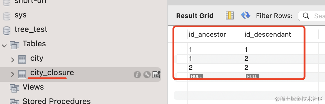 在 city_closure 表里记录了也记录了父子关系。