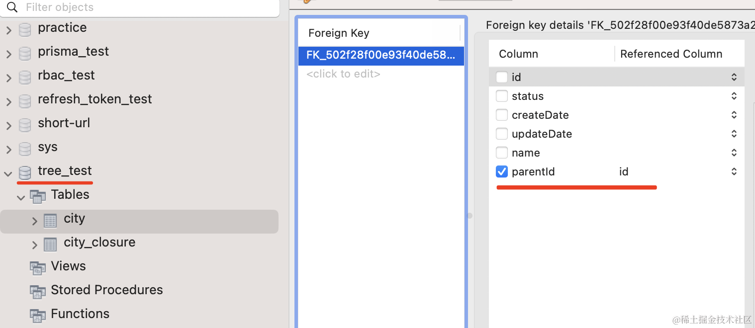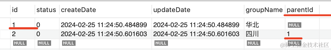 可以看到 parentId 引用了自身的 id。