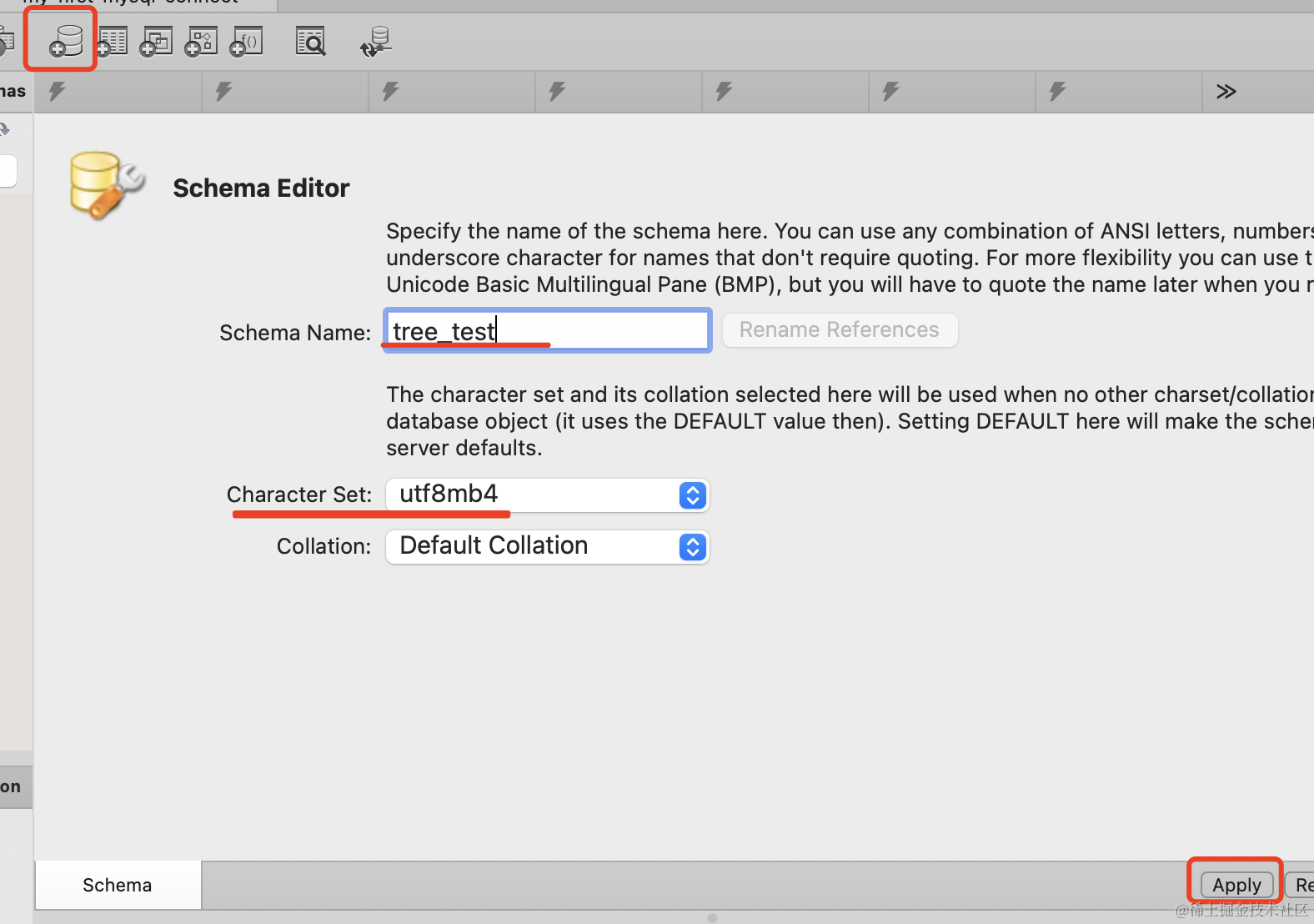 指定字符集为 utf8mb4,点击 apply。