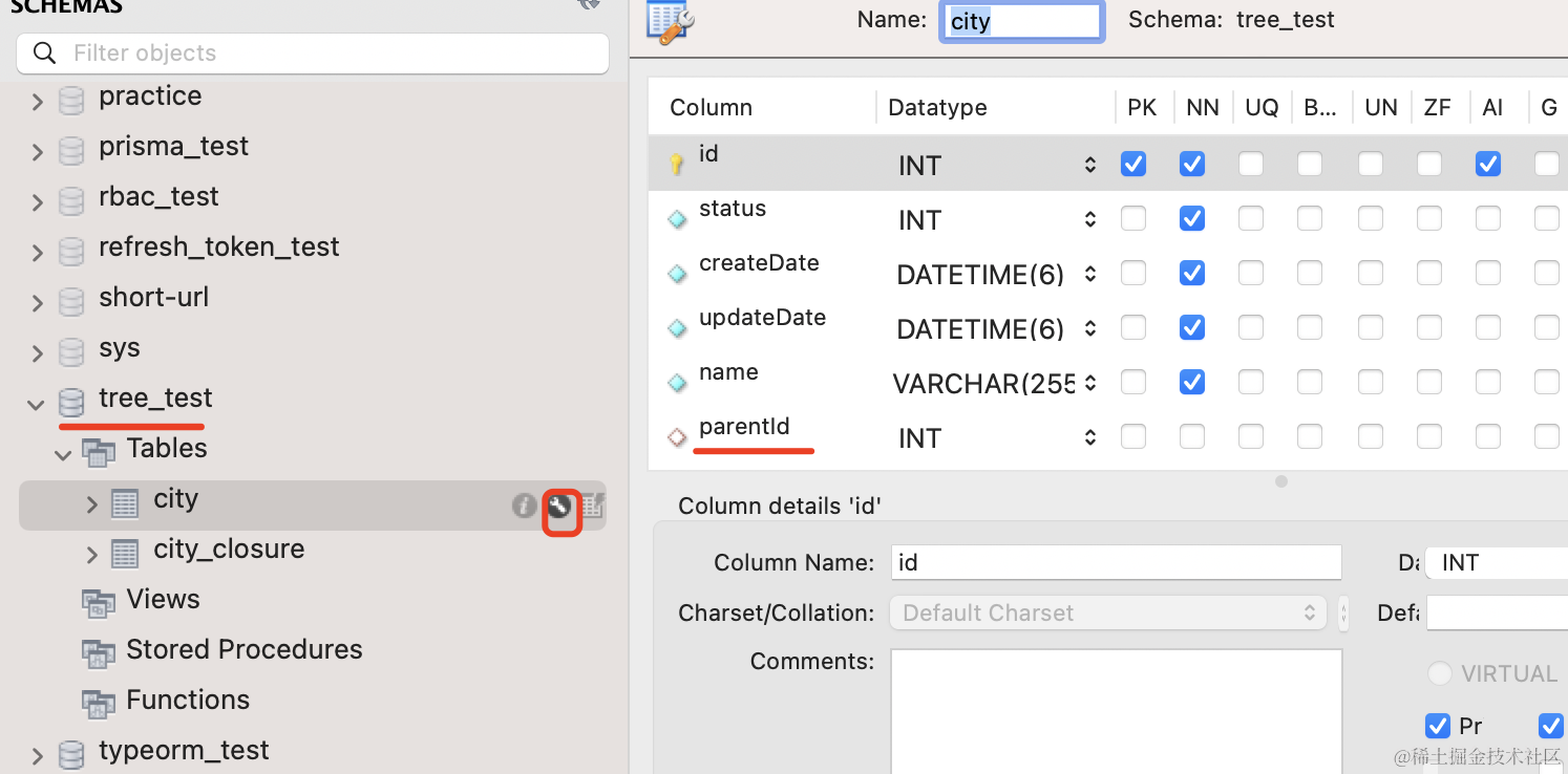 在 city 表里保存着 city 记录之间的父子关系,通过 parentId 关联。