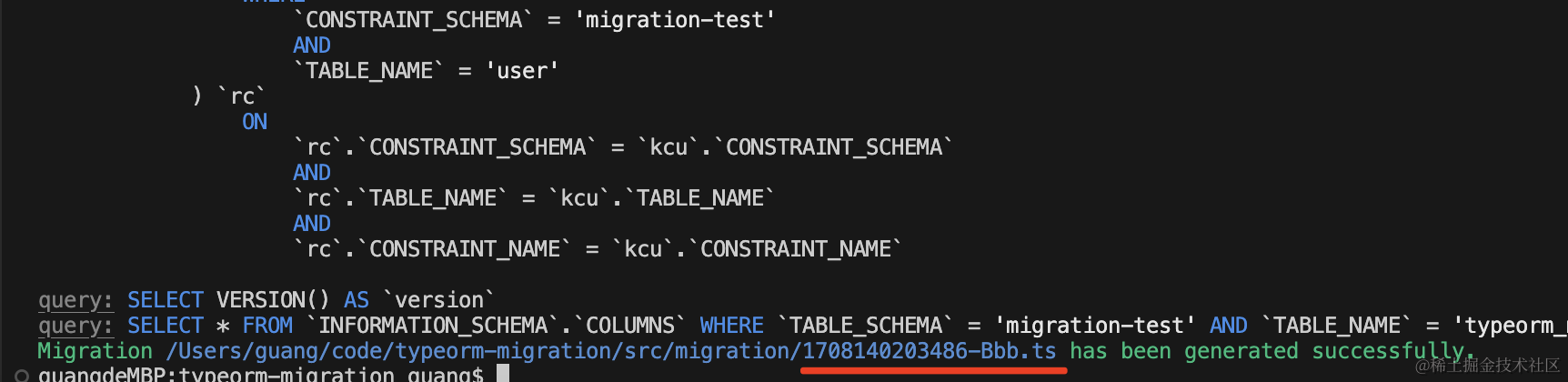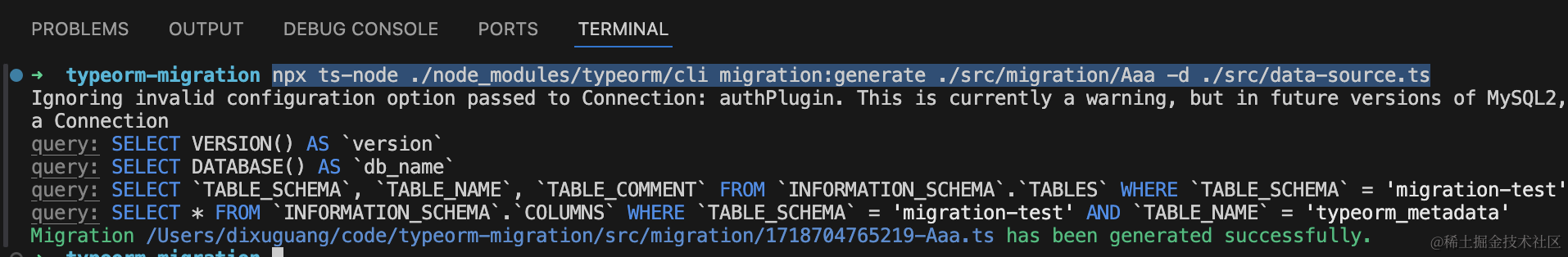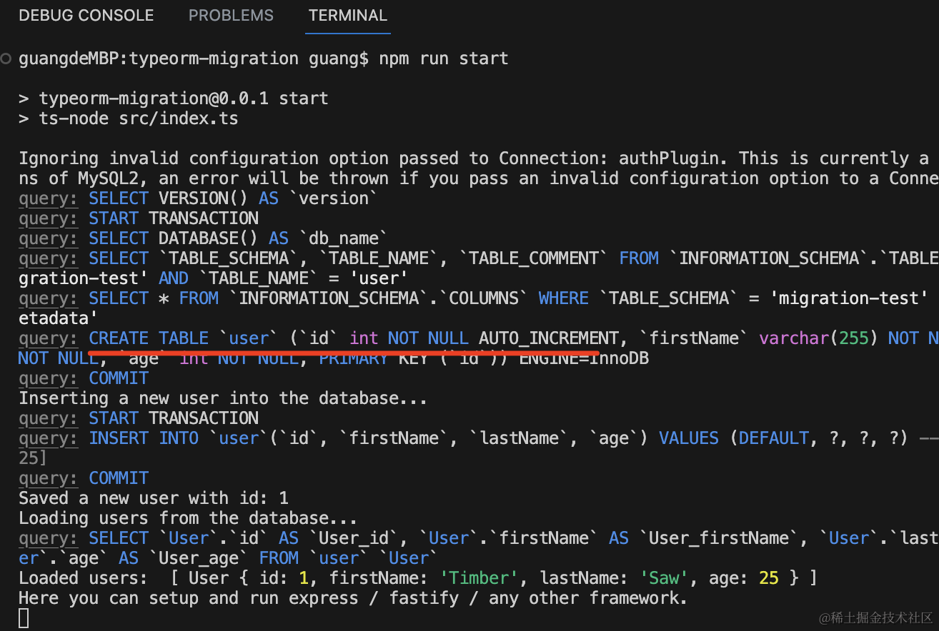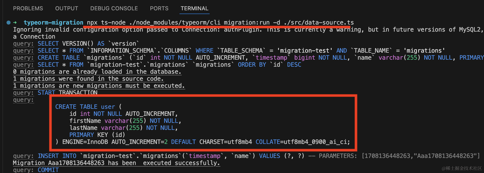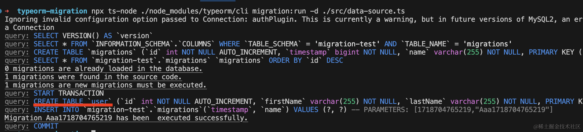 npx ts-node ./node_modules/typeorm/cli migration:run -d ./src/data-source.ts可以看到,执行了 migration 里的 create table 语句。