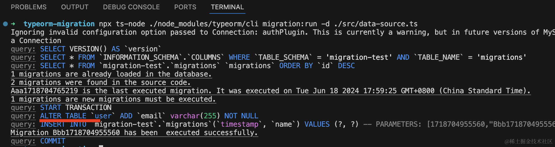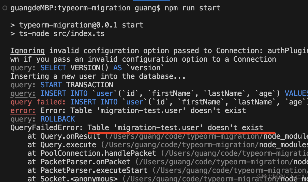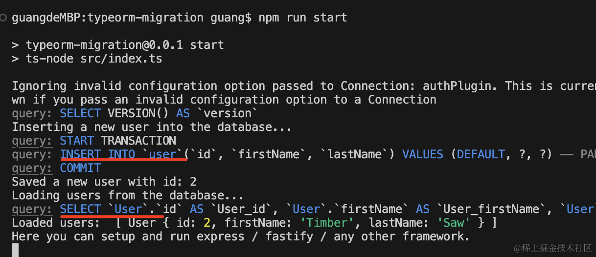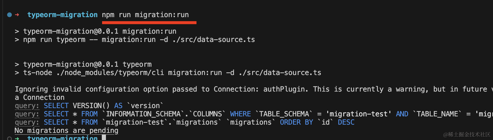 npx ts-node ./node_modules/typeorm/cli migration:run -d ./src/data-source.ts然后再跑下 npm run start: