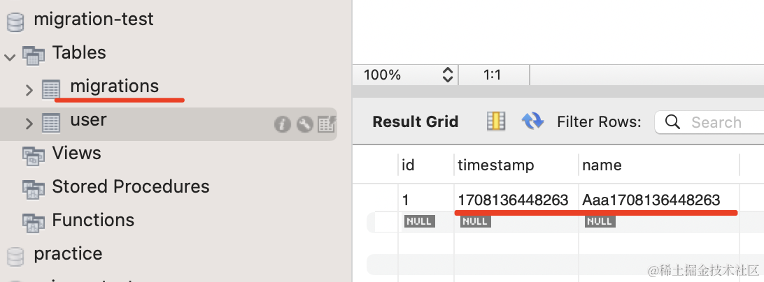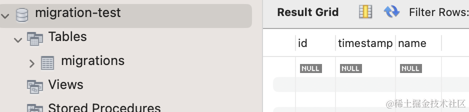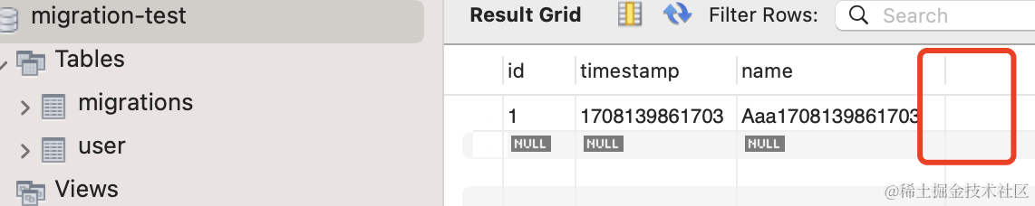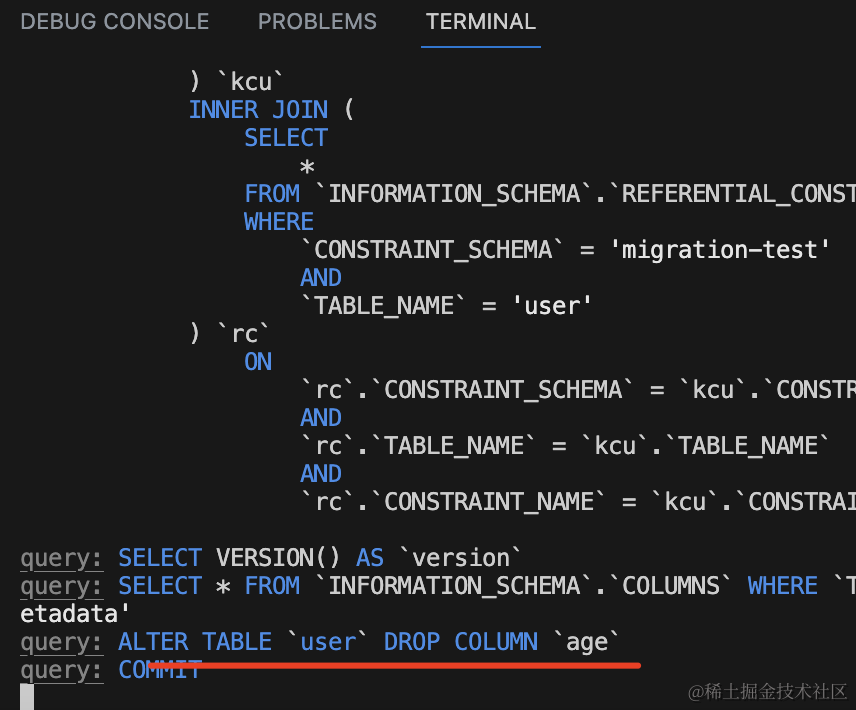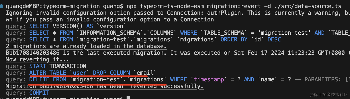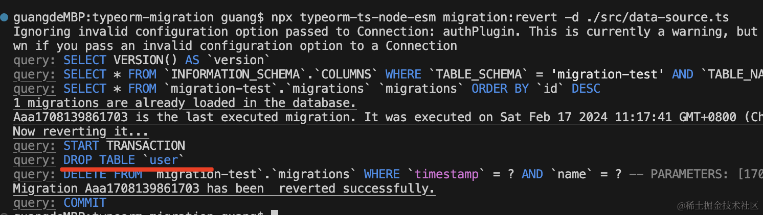 npx ts-node ./node_modules/typeorm/cli migration:revert -d ./src/data-source.ts执行 migration:revert 会执行上次的 migration 的 down 方法,并且从 migrations 表里删掉执行记录。