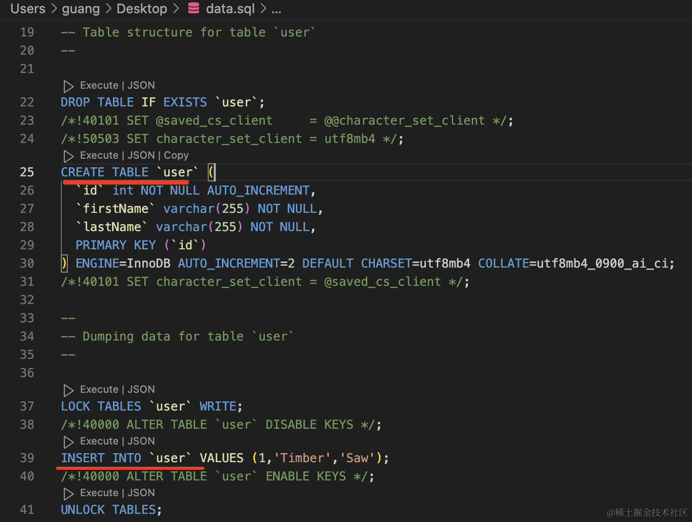 可以看到,生成的 sql 里就包括了 create table 建表语句和插入数据的 insert into 语句: