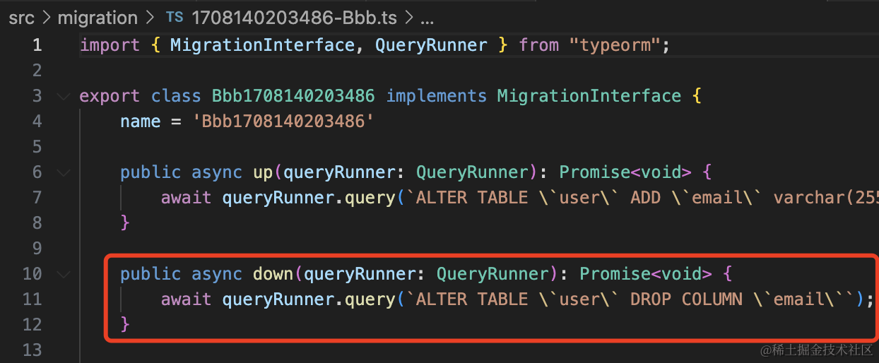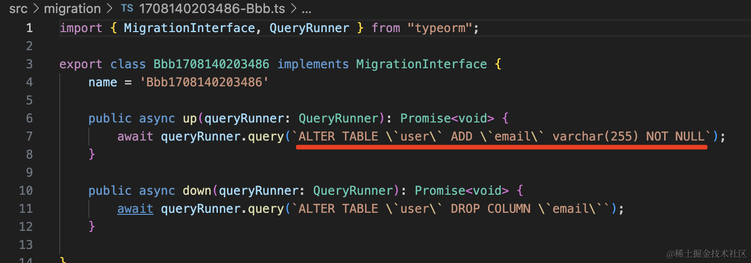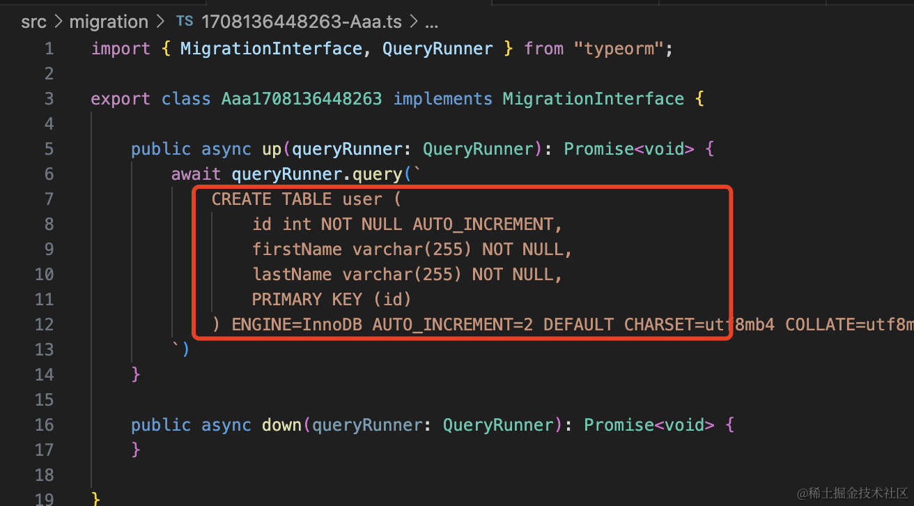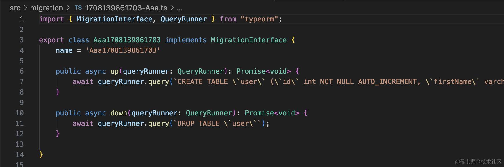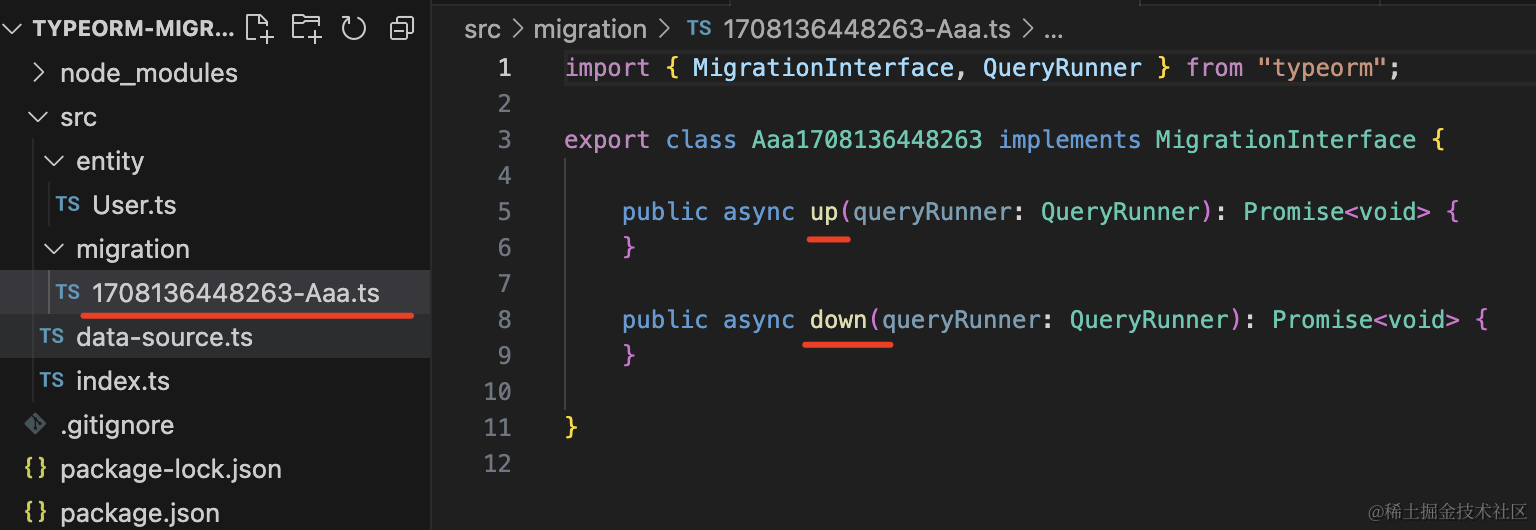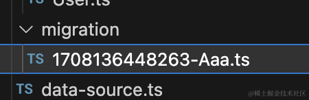 npx ts-node ./node_modules/typeorm/cli migration:create ./src/migration/Aaa生成了 “时间戳-Aaa.ts” 文件,这个就是放迁移代码的: