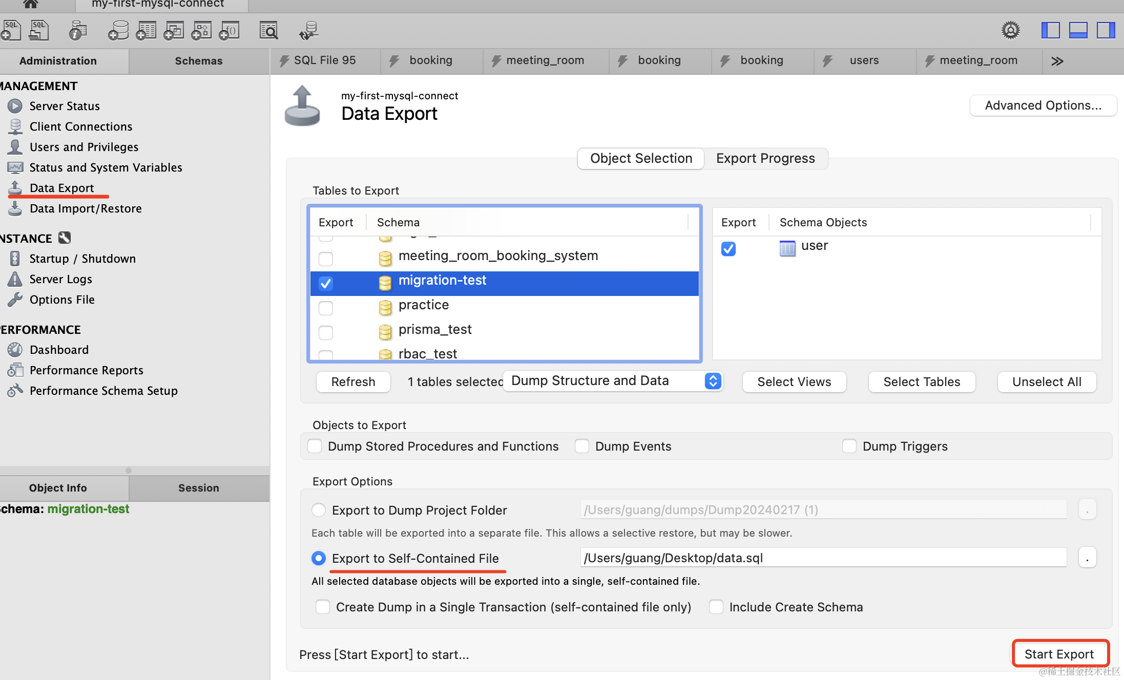 点击左侧的 Data Export,选中要导出的表,指定一个 sql 文件保存位置,点击 Export。