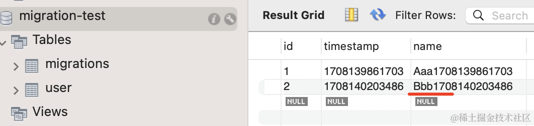 npx typeorm-ts-node-esm migration:run -d ./src/data-source.ts在 migrations 表里记录了 Aaa 跑过,所以这次只会跑 Bbb 的 migration。