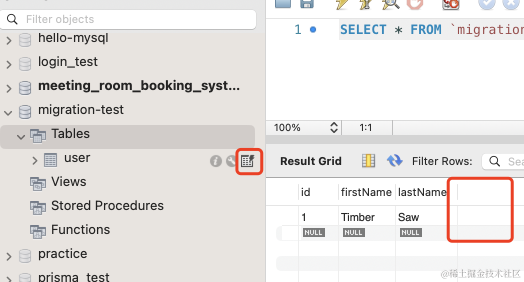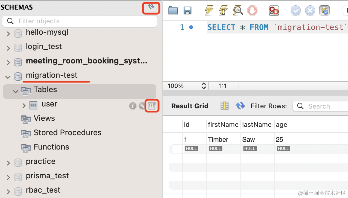 在 mysql workbench 里可以看到,之前的 age 列就没了: