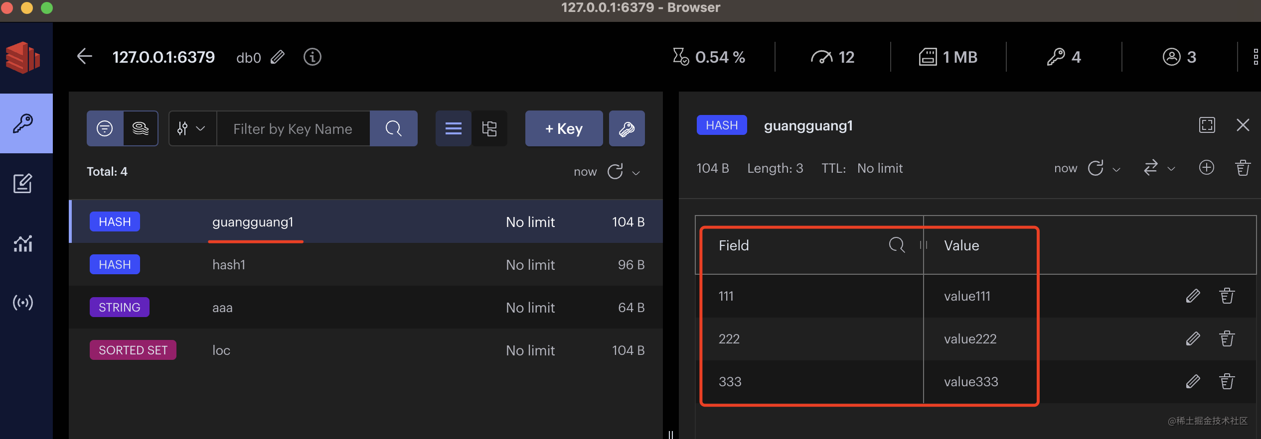 await client.hSet('guangguang1', '333', 'value333');执行以后是这样的:
