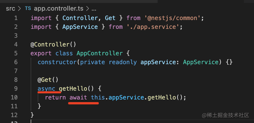 }因为 service 里加了 async、await,那 controller 里也得加一下: