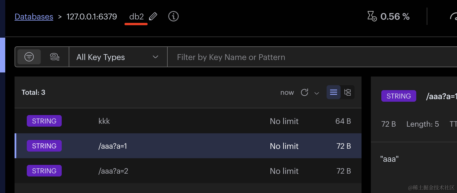 注意,连接的时候我们指定 database为 2,所以在 RedisInsight 里要切到 db2 才可以看到这些数据。