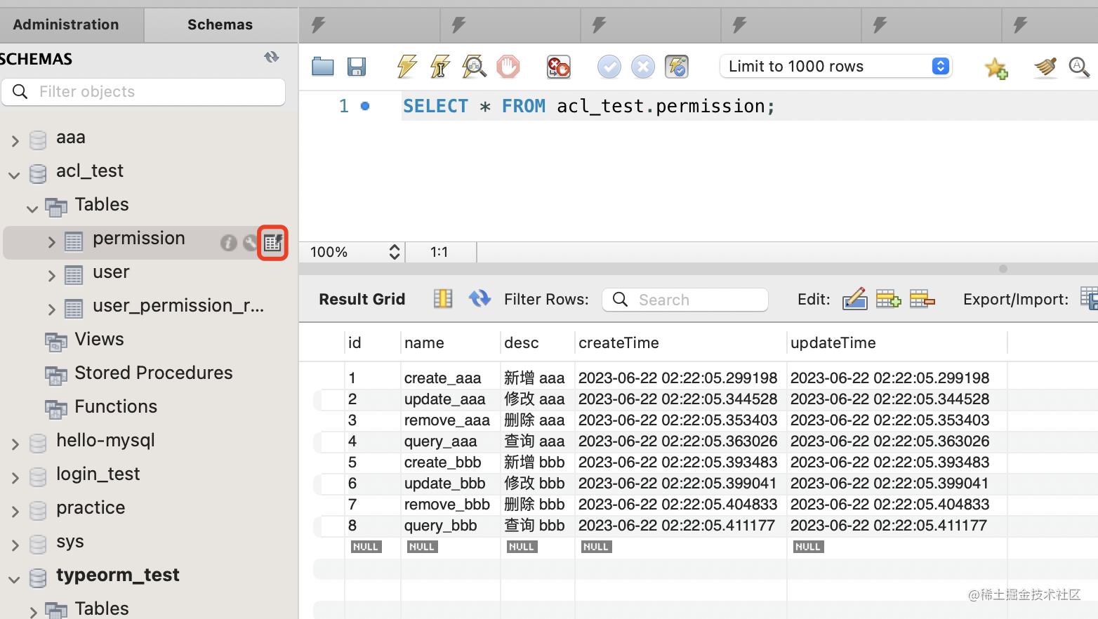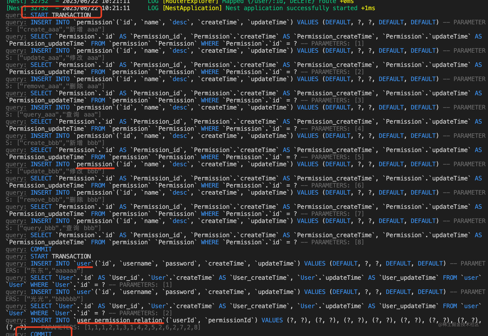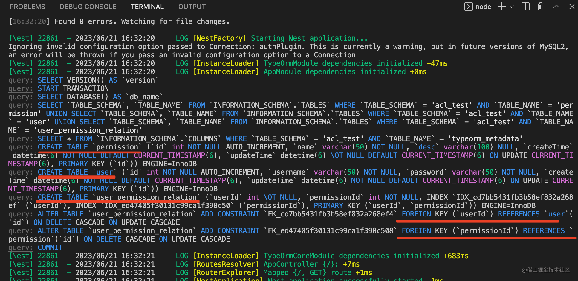 npm run start:dev可以看到生成了 user、permission、user_permission_relation 这 3 个表。
