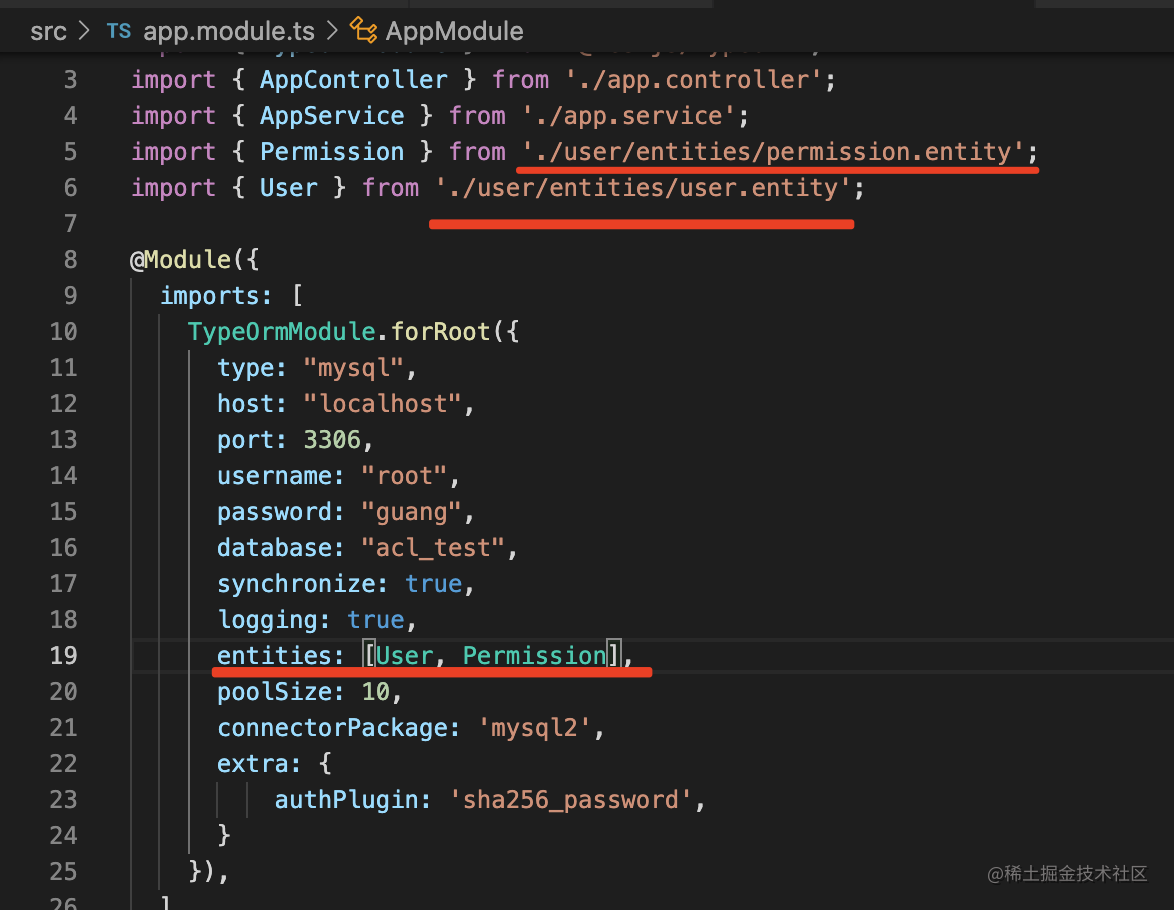 然后在 TypeOrm.forRoot 的 entities 数组加入这俩 entity:
