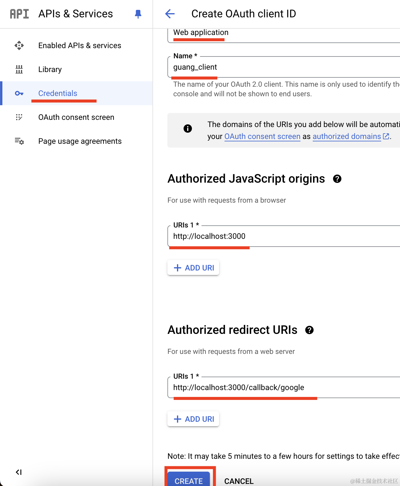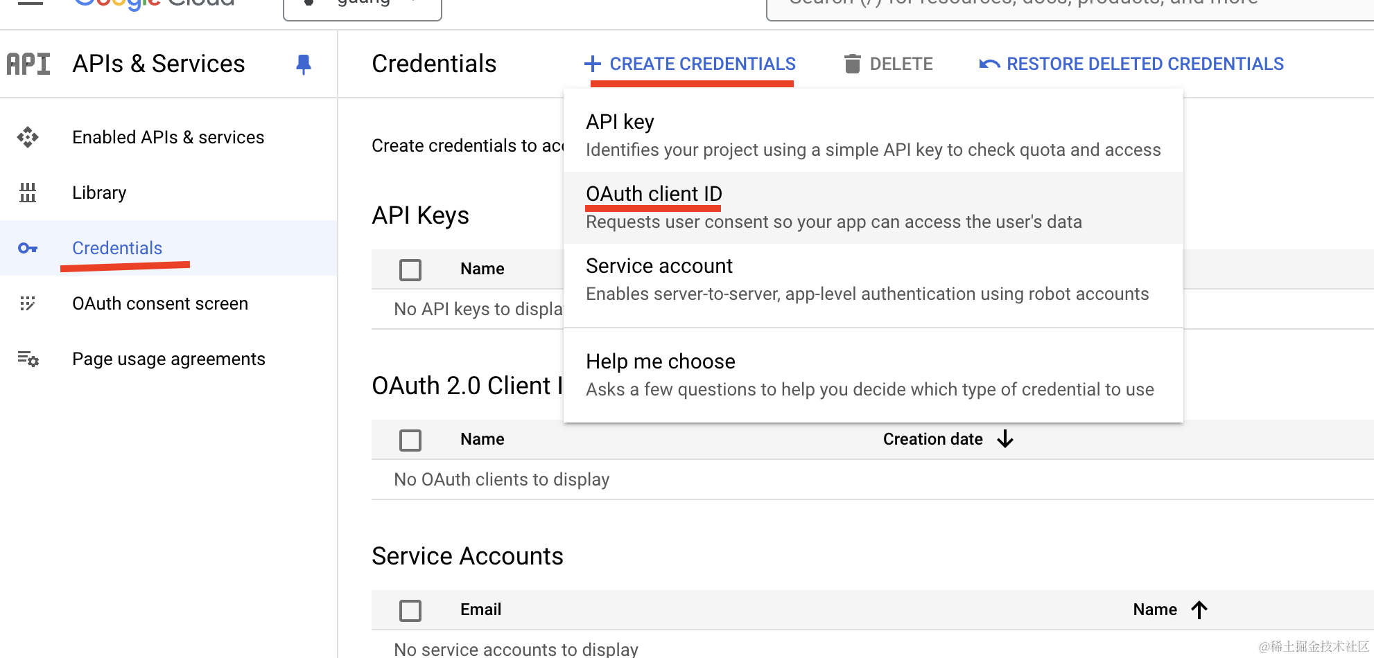 然后点击 Credentials 创建凭证: