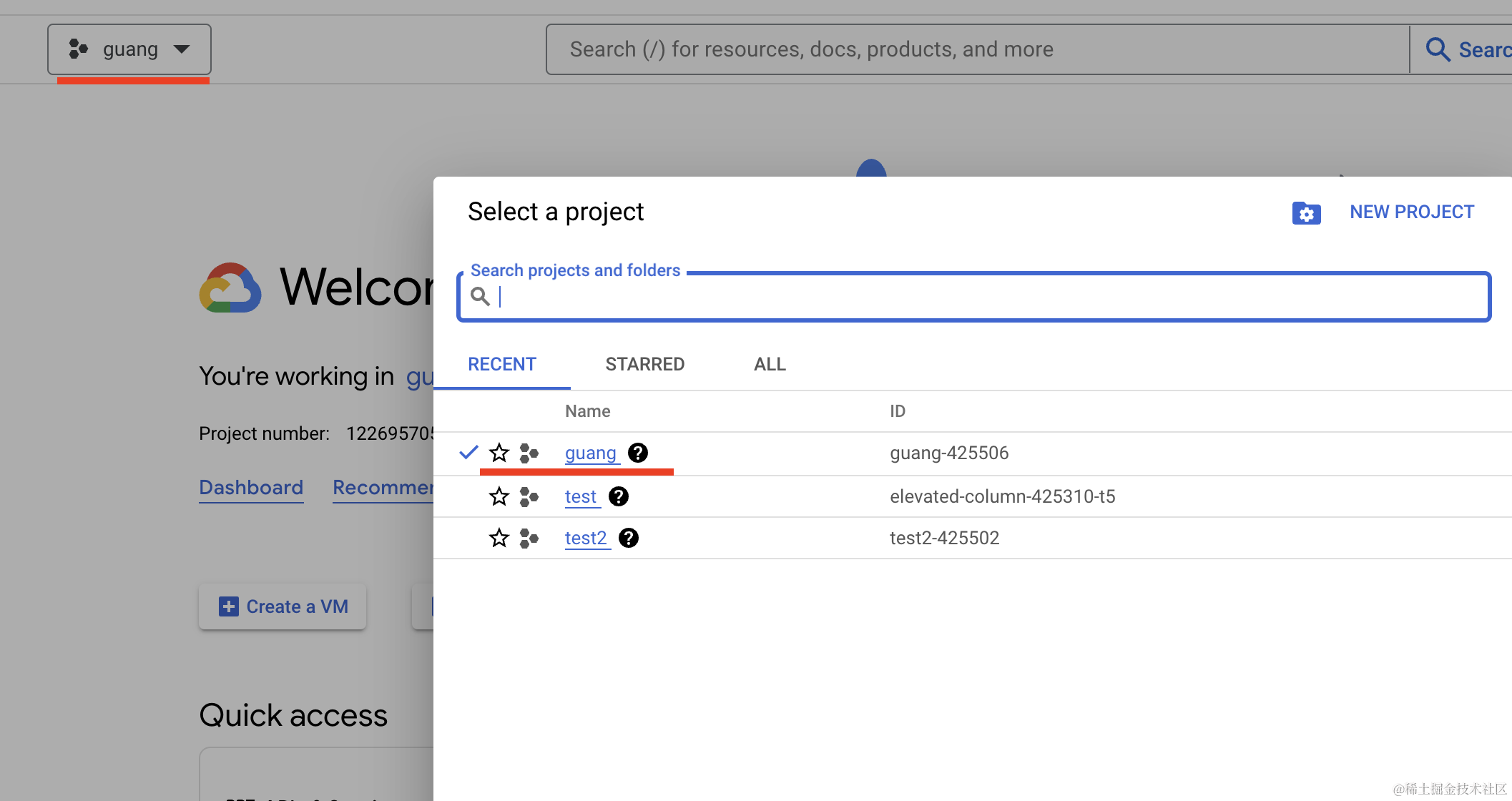 点击左上角的按钮切换到你刚刚创建的 project:
