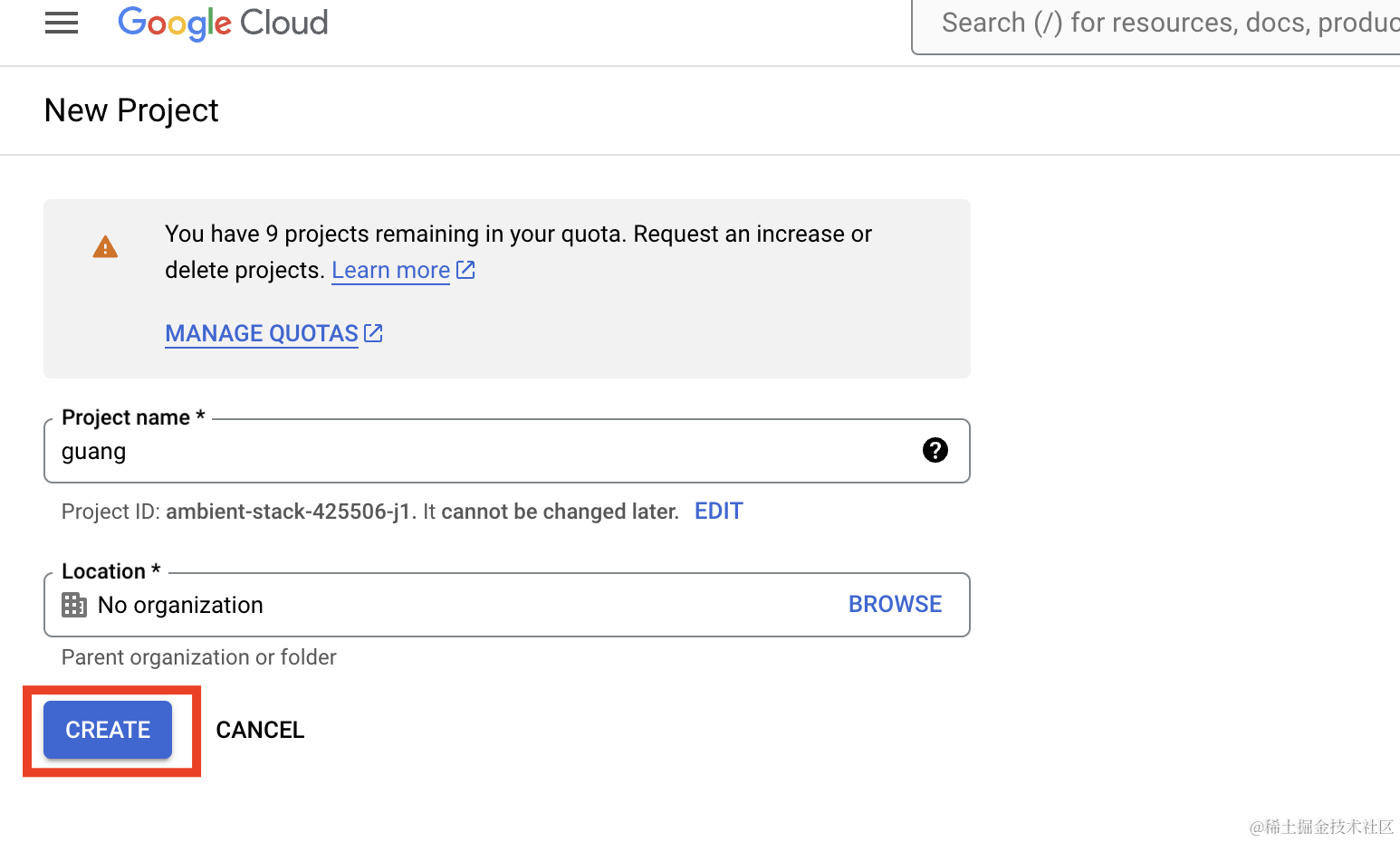 填入项目名后点击 create:
