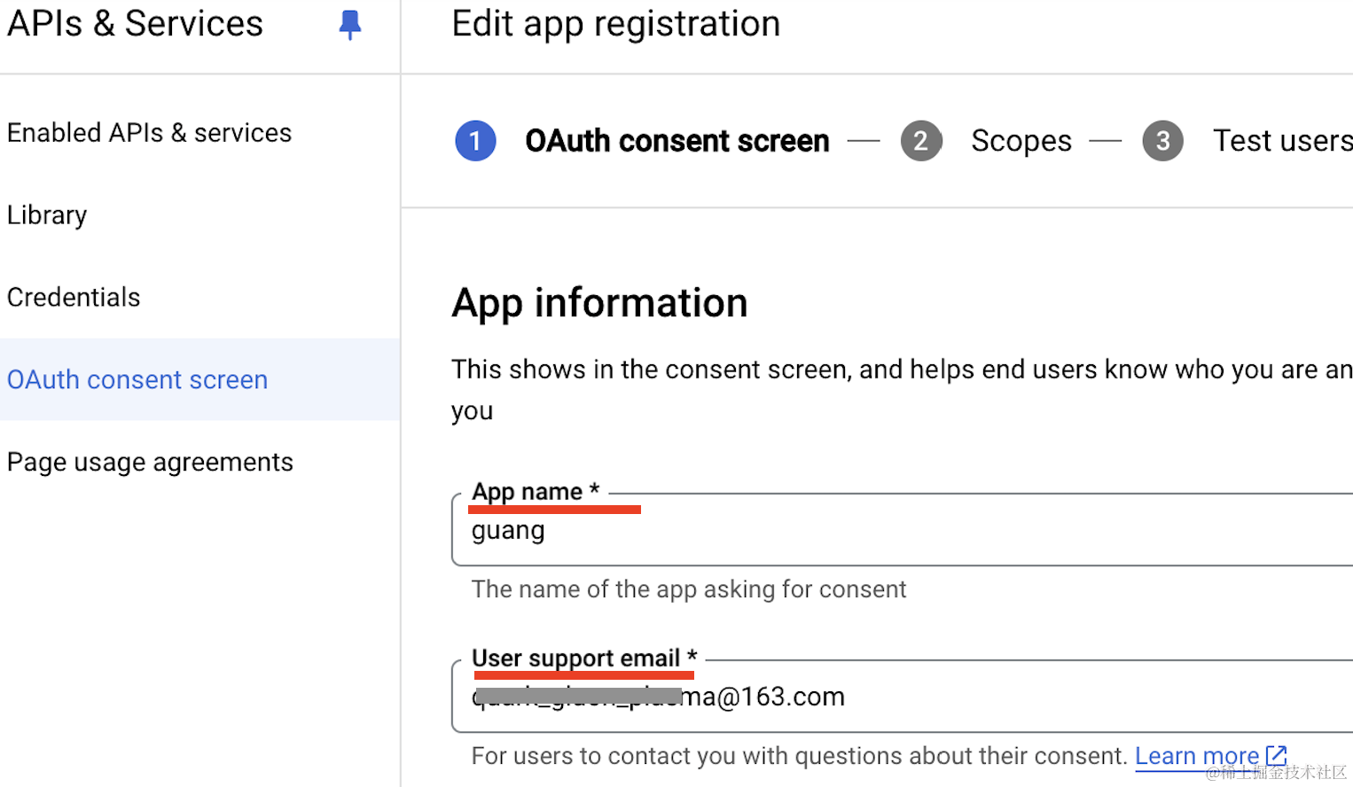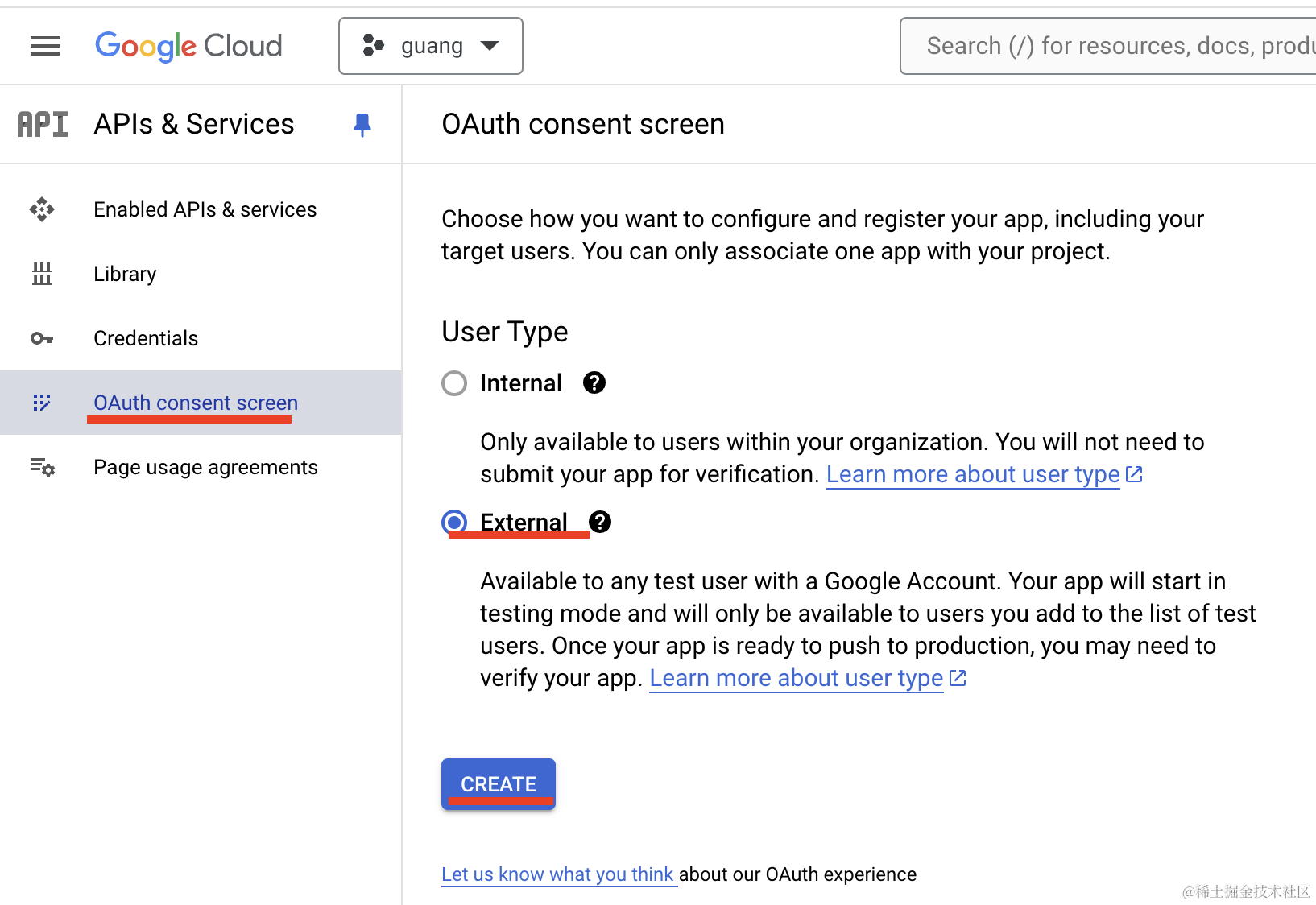 点击 OAuth consent screen,然后勾选 external,点击 create: