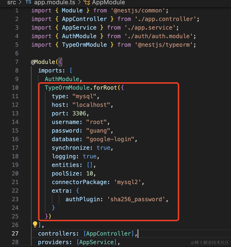npm install --save @nestjs/typeorm typeorm mysql2AppModule 里引入 TypeOrmModule: