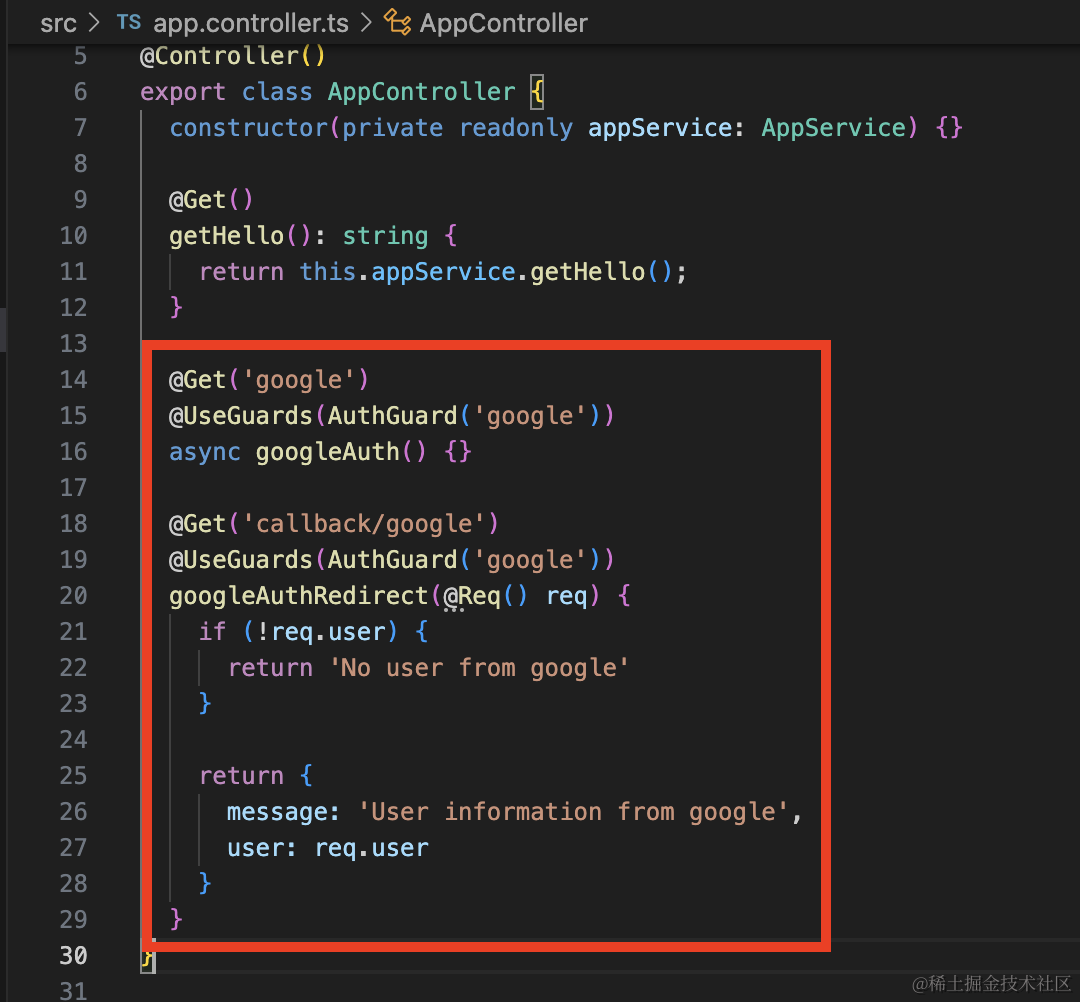 export class AuthModule {}之后在 AppController 添加两个路由: