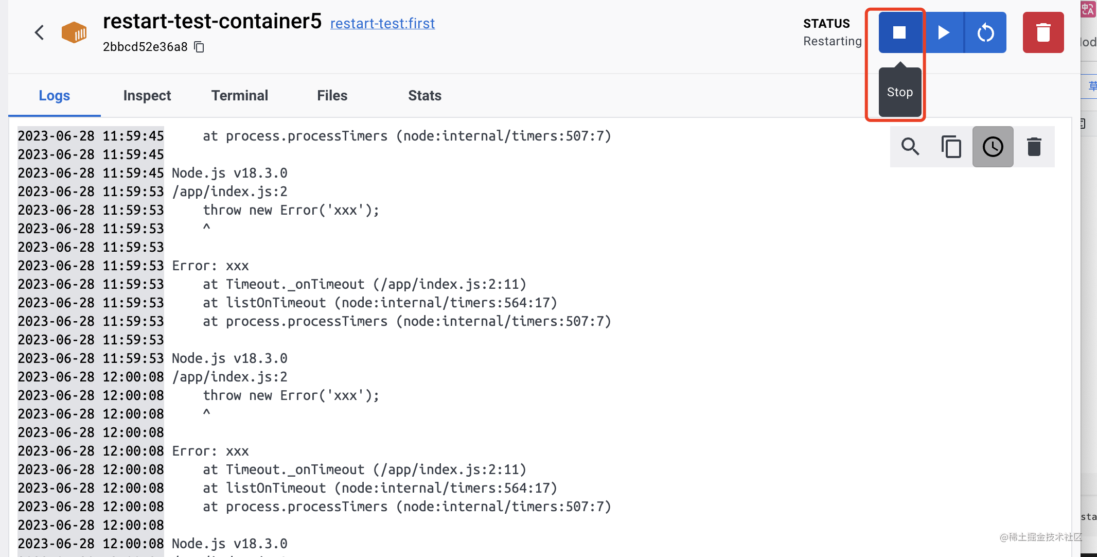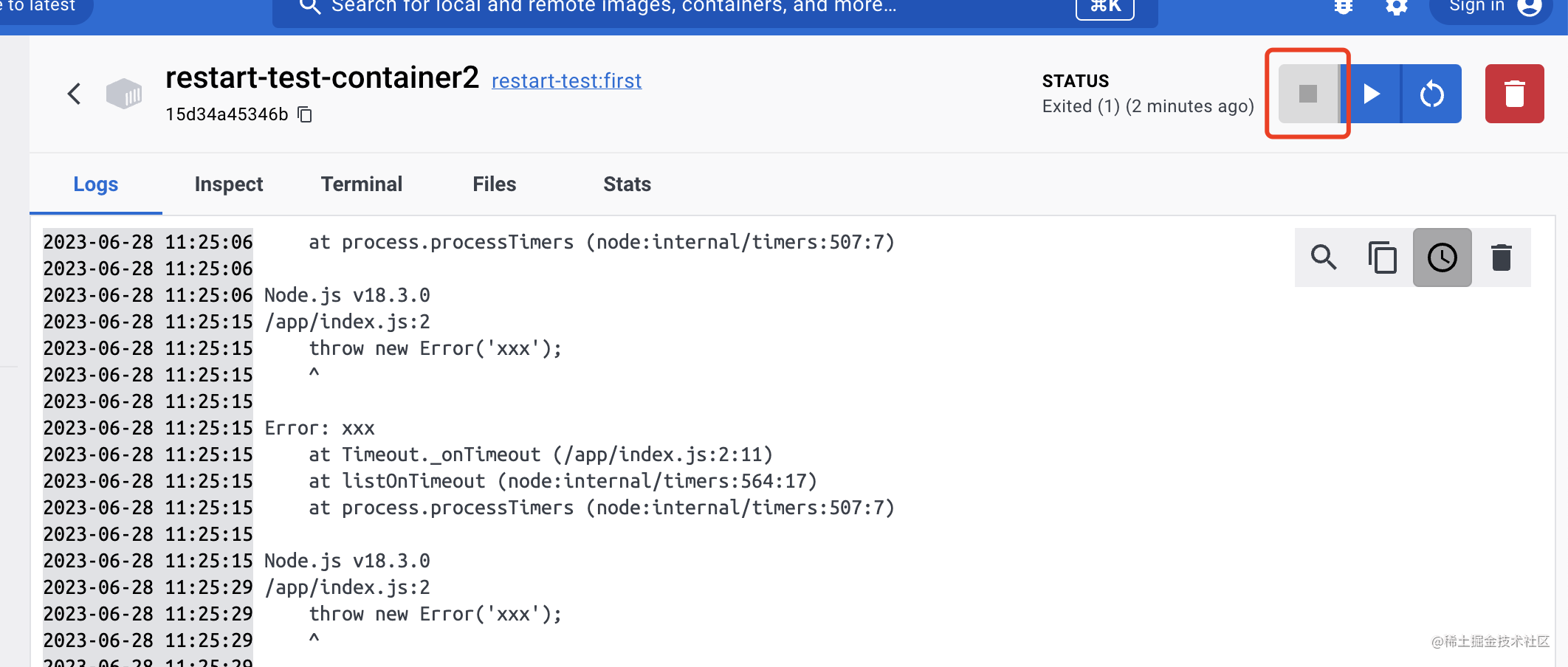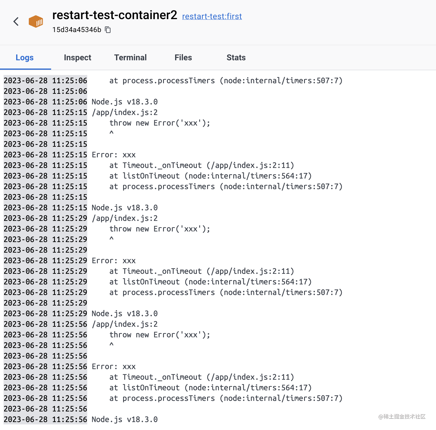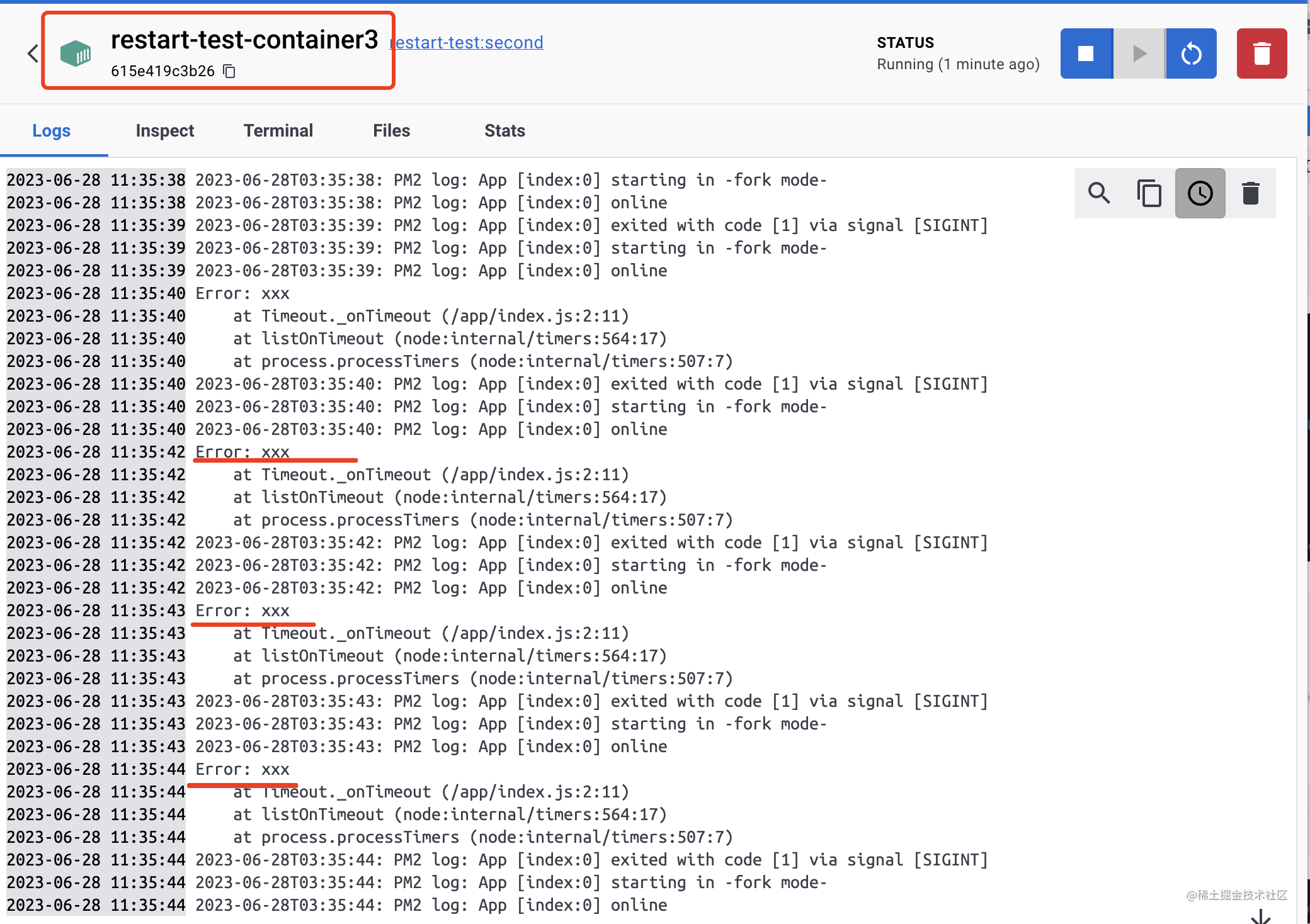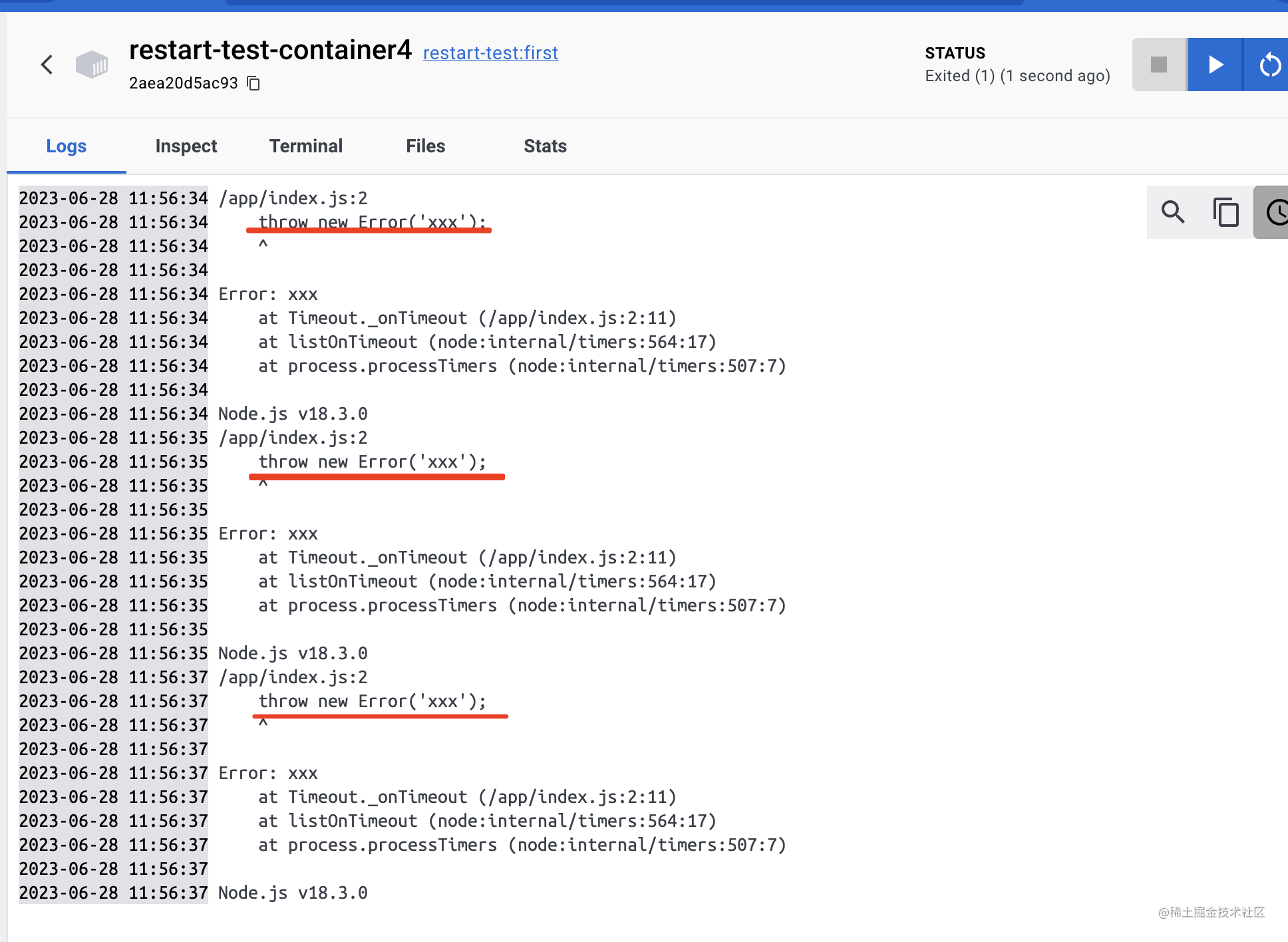 docker run -d --restart=on-failure:2 --name=restart-test-container4 restart-test:first可以看到容器重启了 2 次,一共打印了 3 次错误就不再重启了: