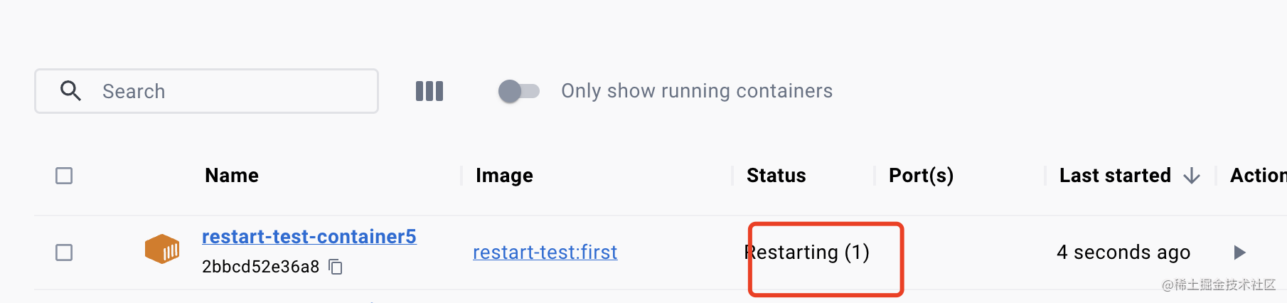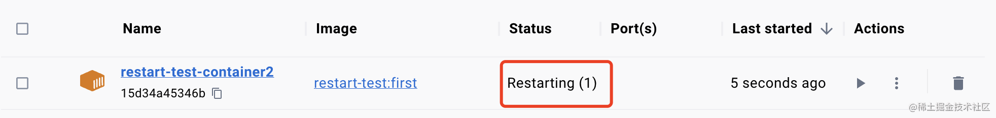 然后你在 docker desktop 里就可以看到它一直在 restart: