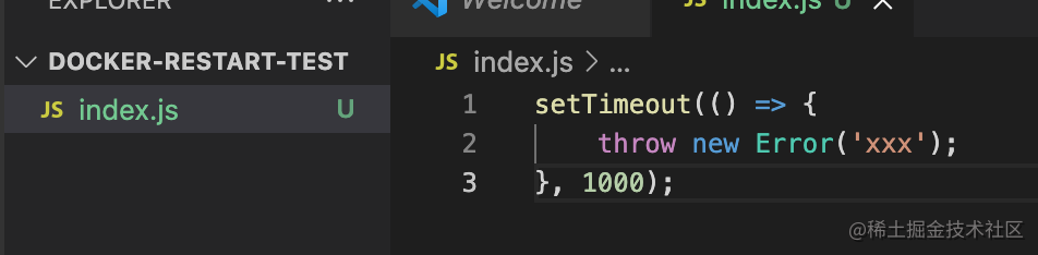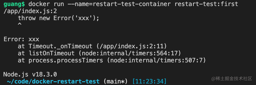 docker run --name=restart-test-container restart-test:first可以看到,容器 1s 后就停掉了: