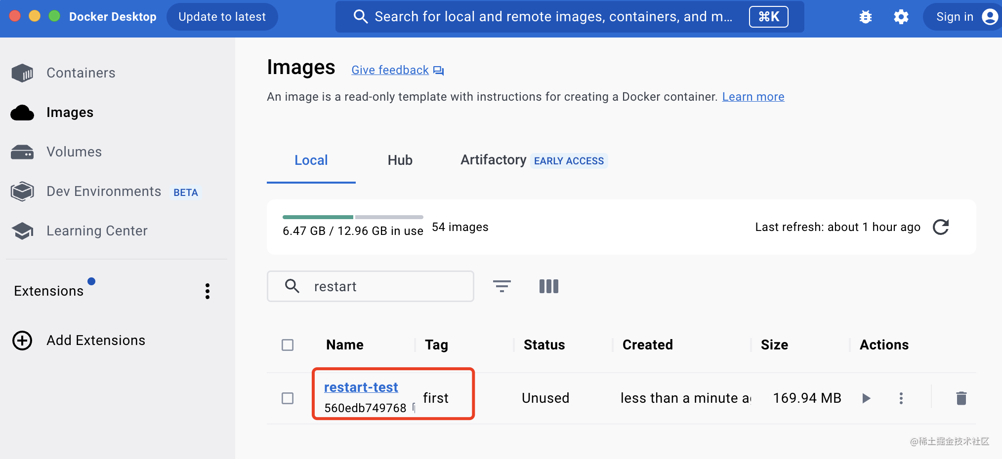 docker build -t restart-test:first .在 docker desktop 里可以看到: