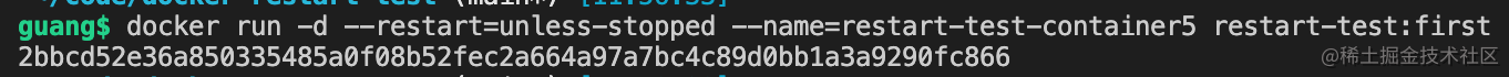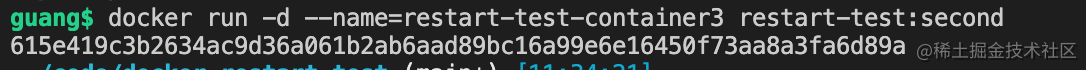 docker run -d --restart=always --name=restart-test-container2 restart-test:first这次加上 -d 把它放到后台跑。