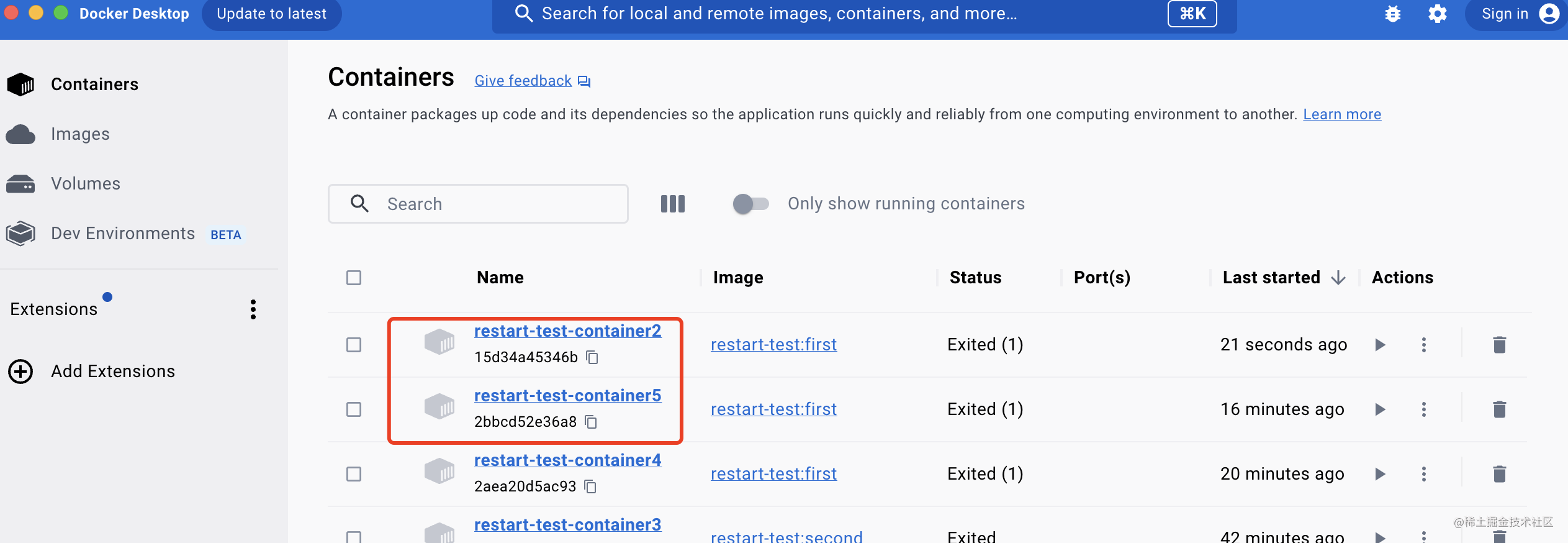 现在 docker-test-container2 是用的 always 的重启策略,docker-test-container5 是用的 unless-stopped 的重启策略: