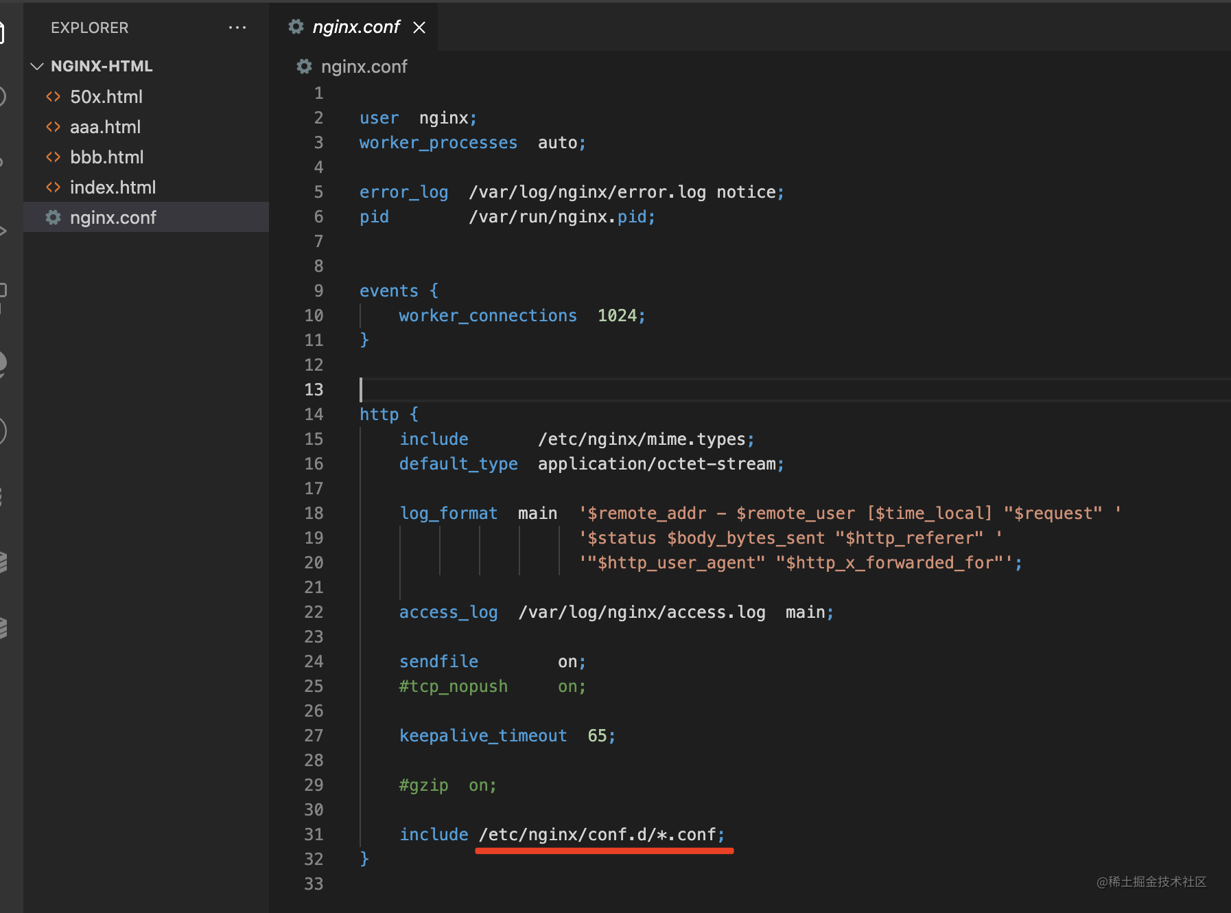 可以看到 http 下面有个 include 引入了 /etc/nginx/conf.d/*.conf 的配置。