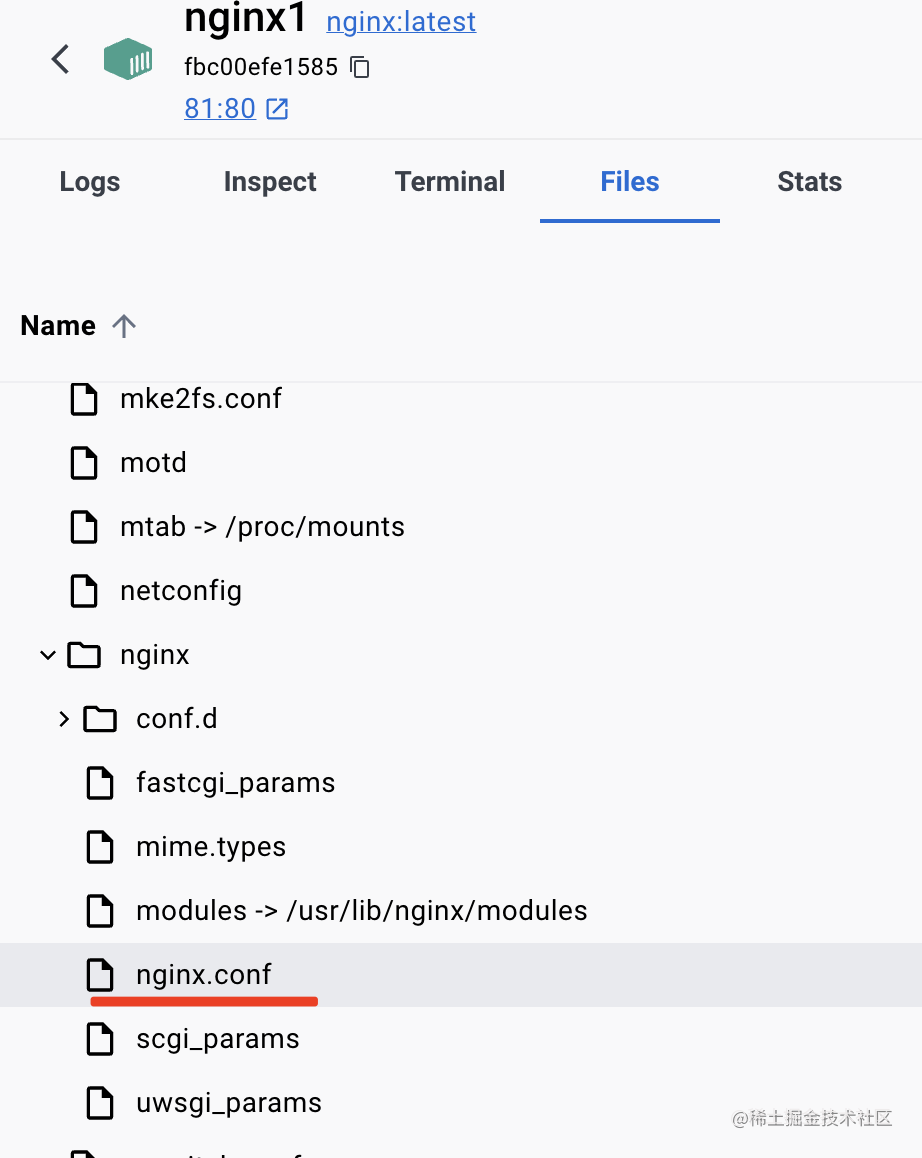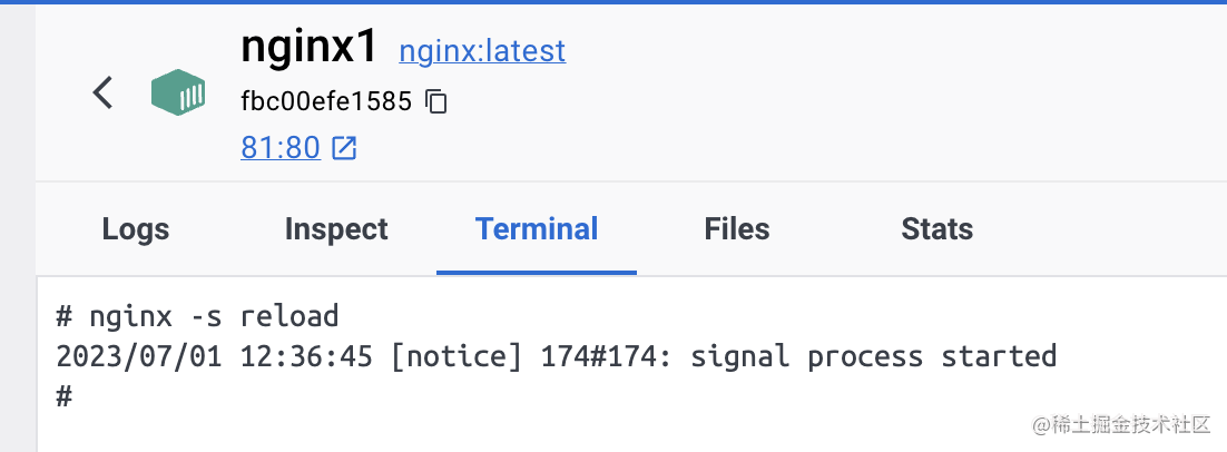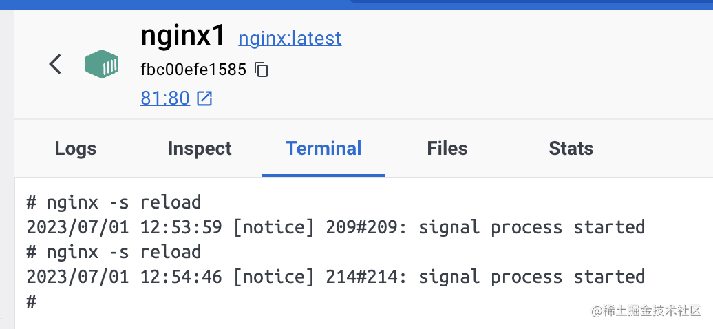 docker cp ~/nginx-html/conf.d/default.conf nginx1:/etc/nginx/conf.d/default.conf然后在容器内的 terminal 执行: