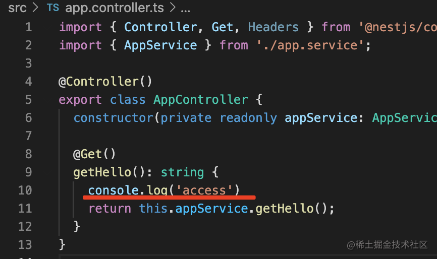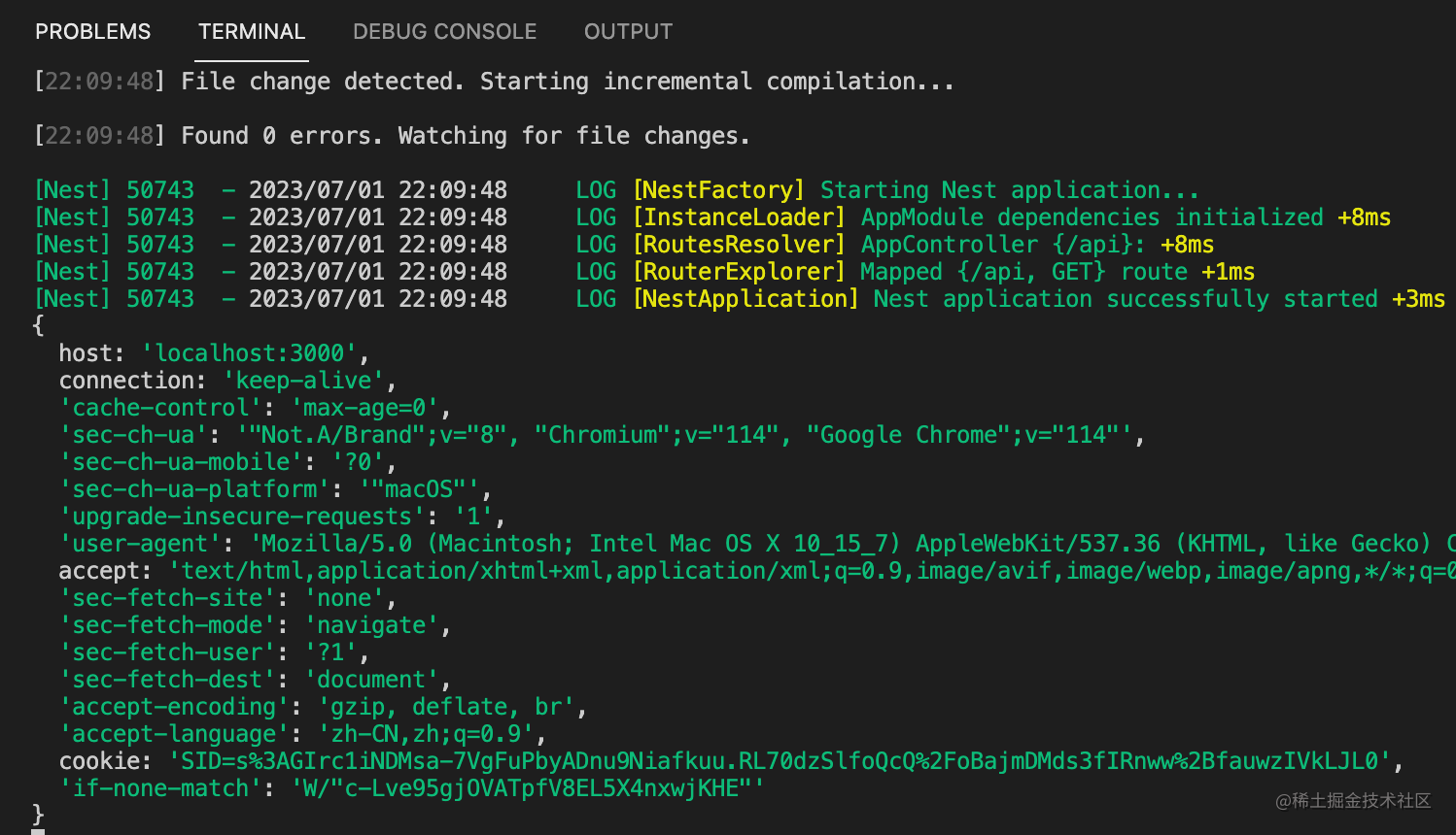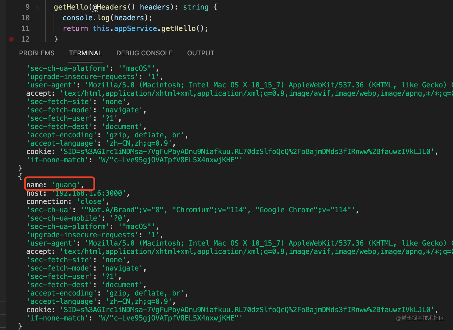 docker cp ~/nginx-html/conf.d/default.conf nginx1:/etc/nginx/conf.d/default.conf在 nest 服务的 handler 里注入 headers,打印一下: