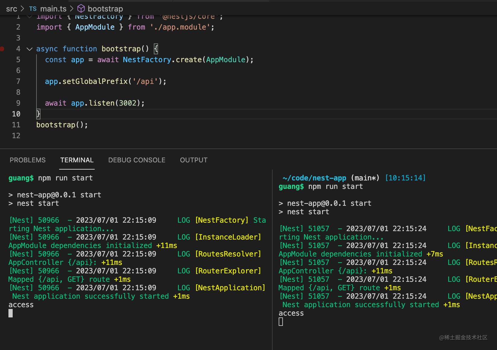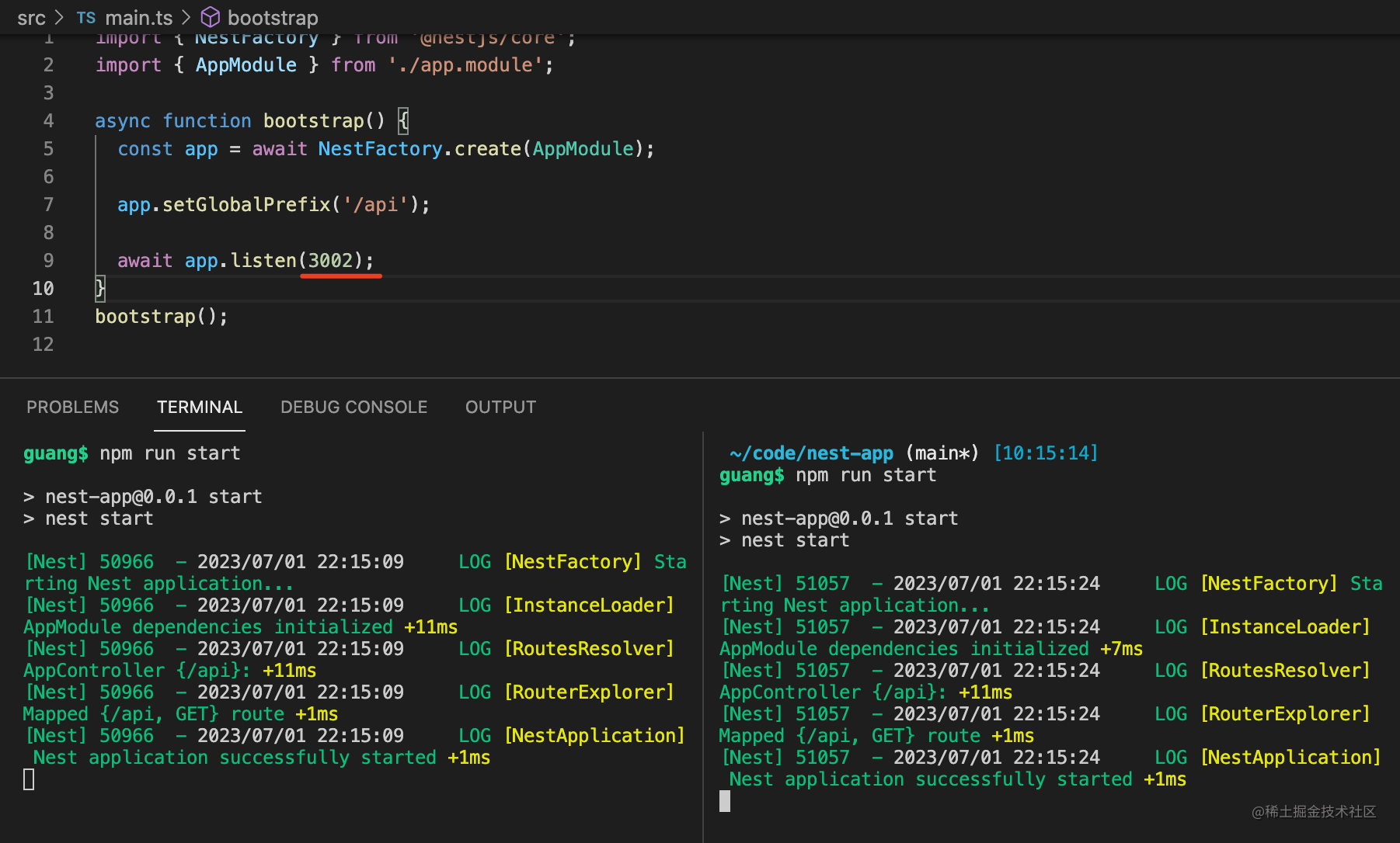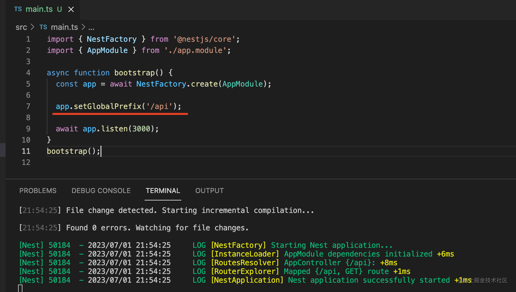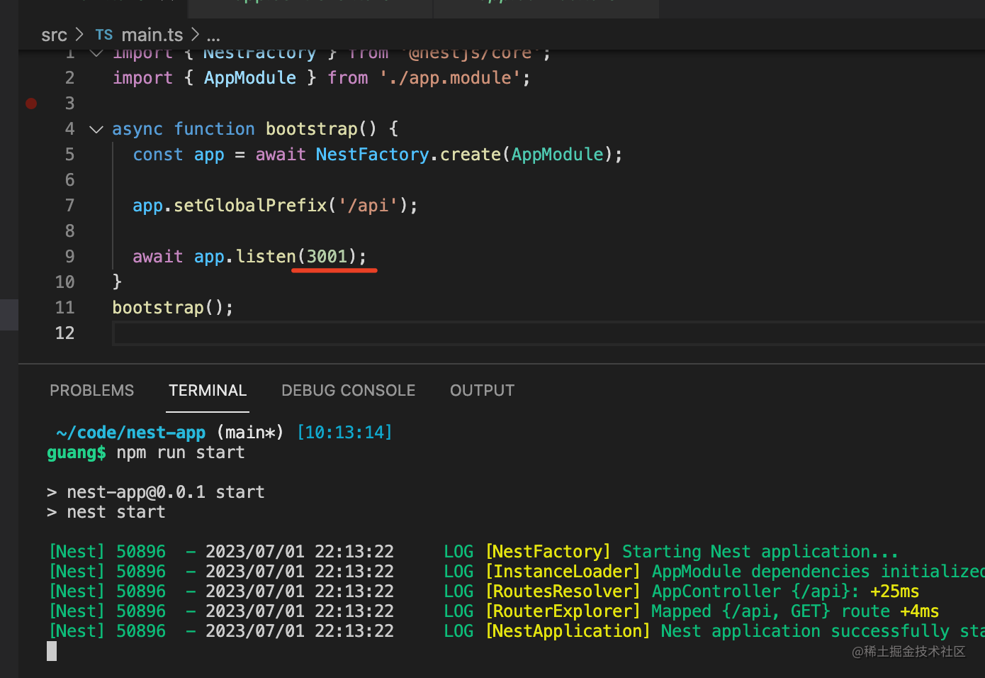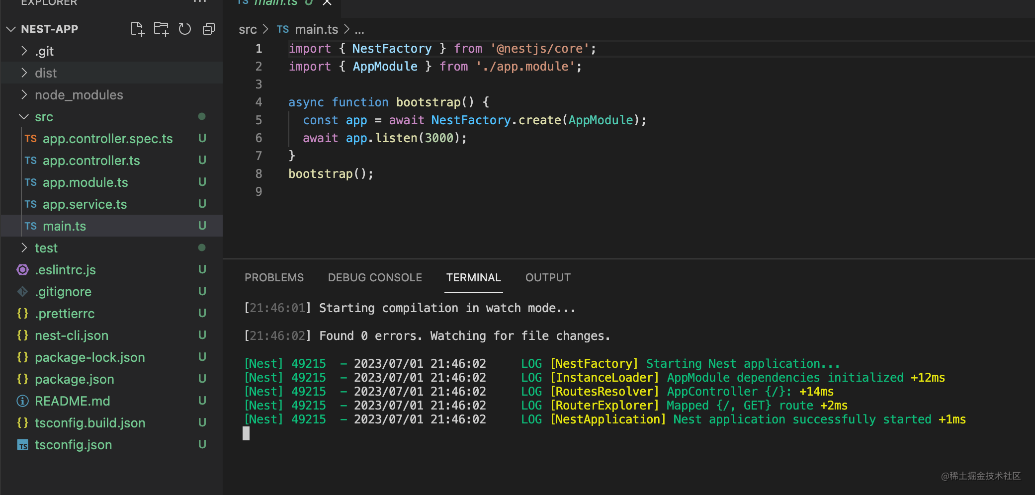 npm run start:dev浏览器就访问 http://localhost:3000 看到 hello world 就代表 nest 服务跑成功了: