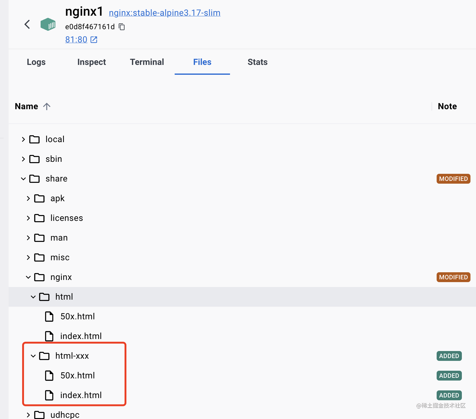 docker cp ~/nginx-html nginx1:/usr/share/nginx/html-xxx可以看到容器内就多了这个目录: