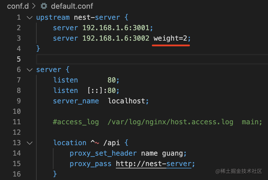 添加一个 weight=2,默认是 1,这样两个服务器轮询到的几率是 2 比 1。