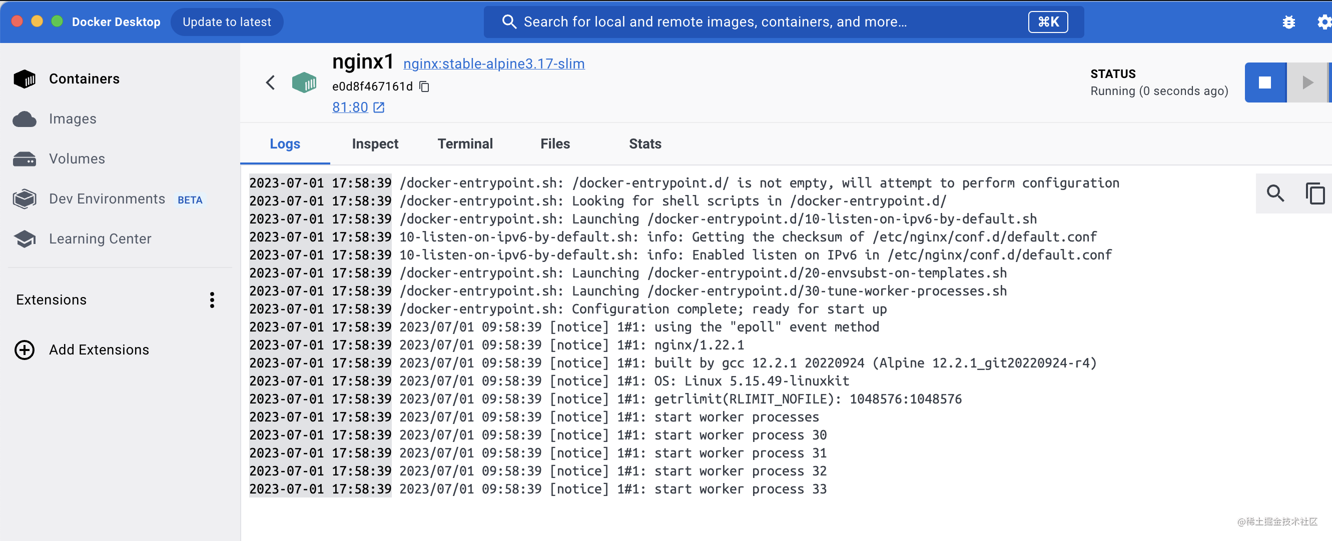 这时候就可以看到 docker 容器跑起来了,并且打印了日志: