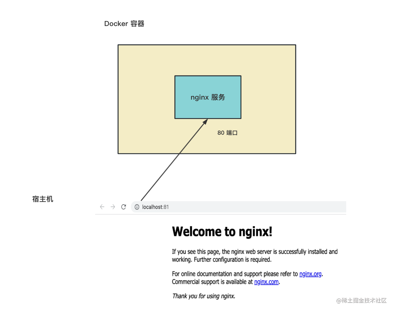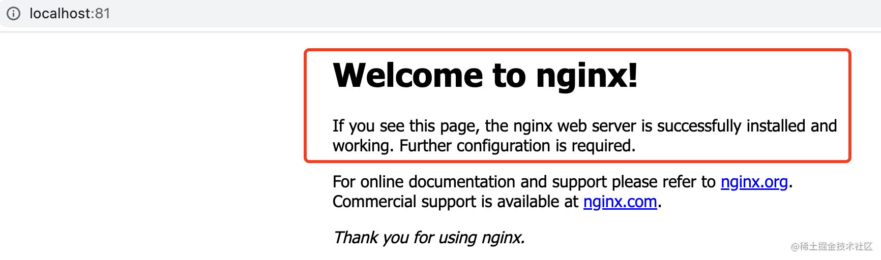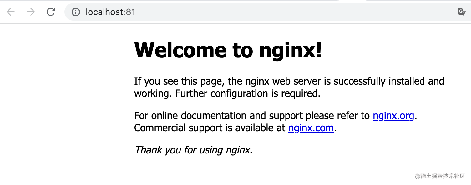 浏览器访问下 http://localhost:81 可以看到 nginx 欢迎页面: