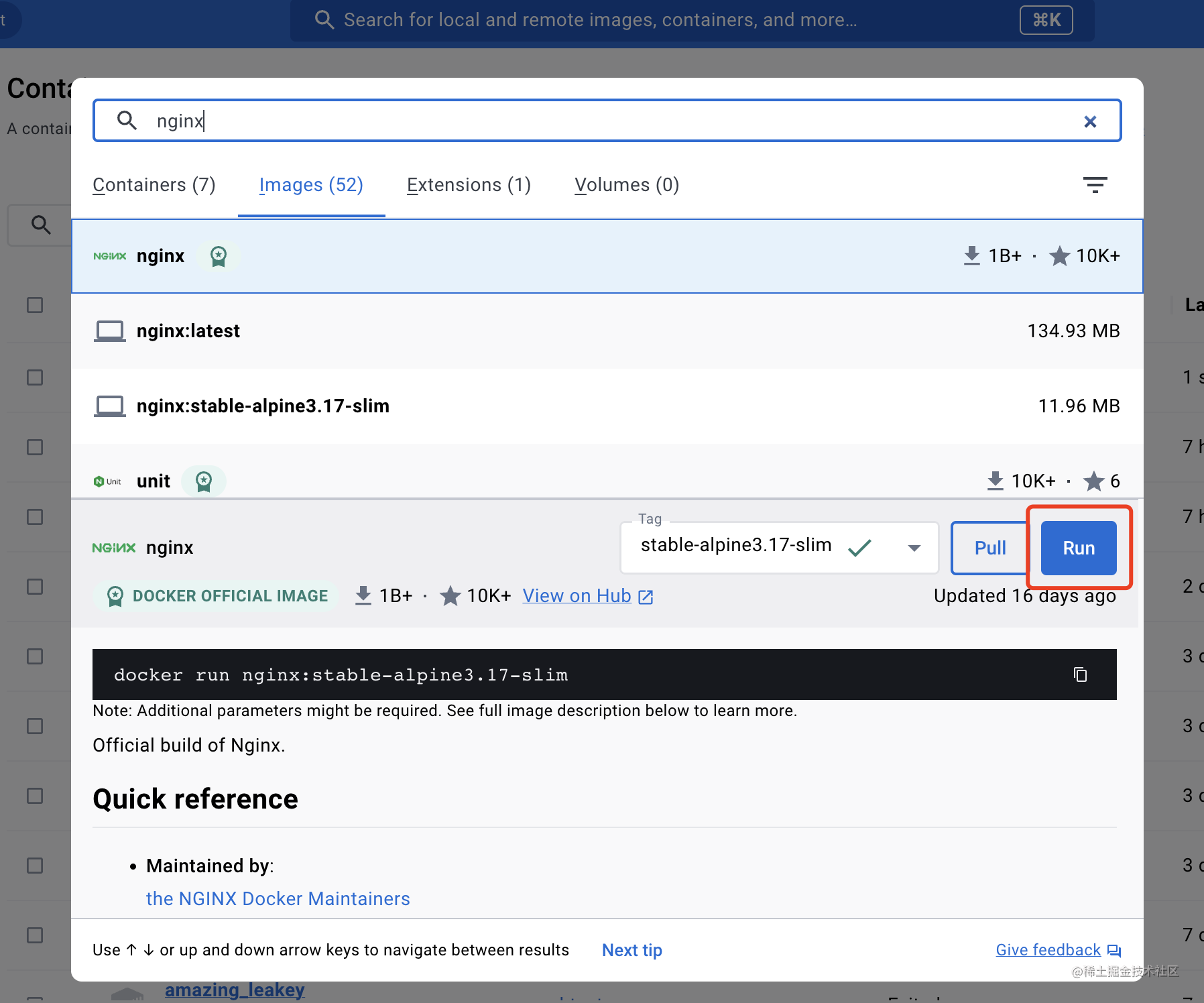 搜索 nginx(这一步需要科学上网,因为要访问 hub.docker.com 这个网站),点击 run: