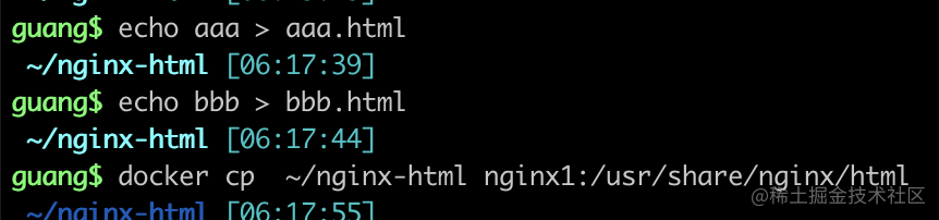 docker cp ~/nginx-html nginx1:/usr/share/nginx/html但当目标目录存在的时候,docker 会把他复制到目标目录下面: