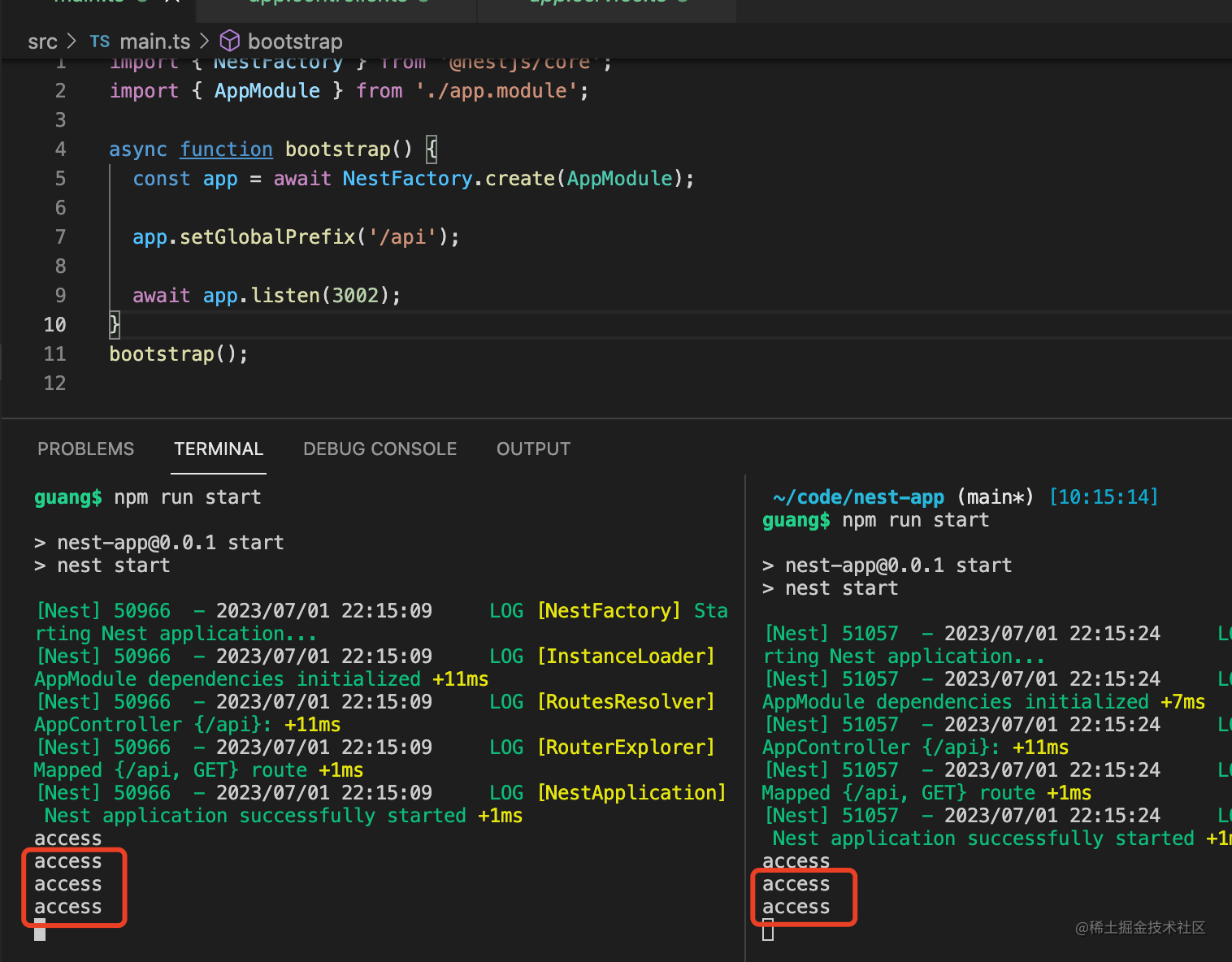 可以看到两个 nest 服务,一个 3 次,一个 2 次。