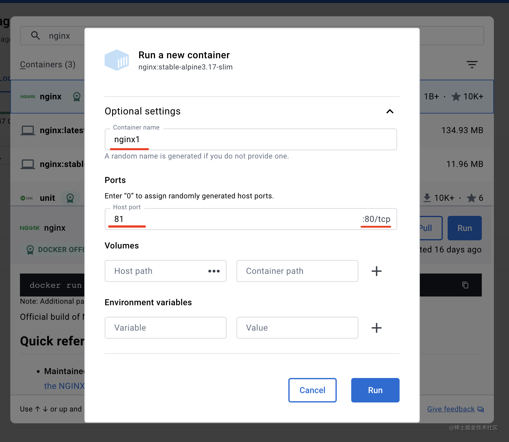这里把宿主机的 81 端口映射到容器内的 80 端口,点击 run。