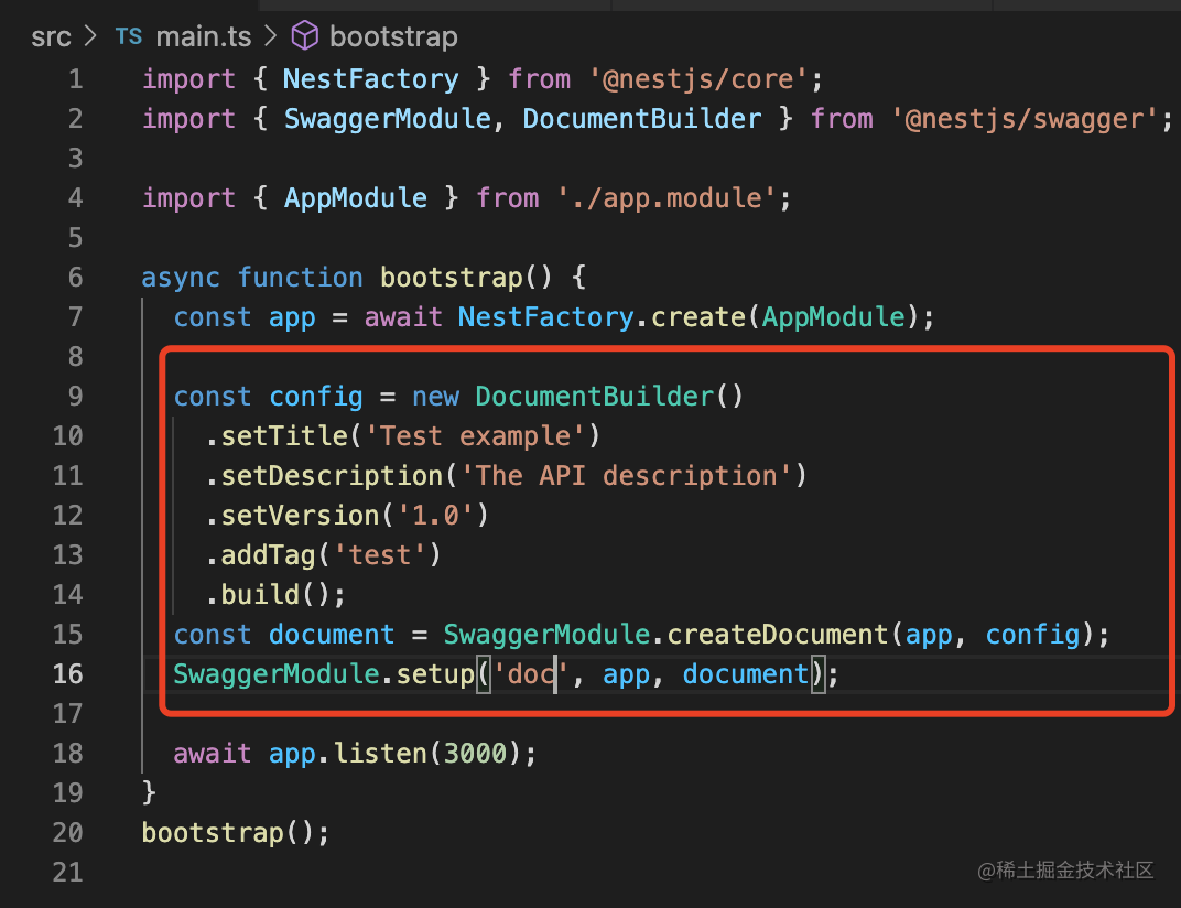 SwaggerModule.setup('doc', app, document);通过 DocumentBuilder 创建 config。