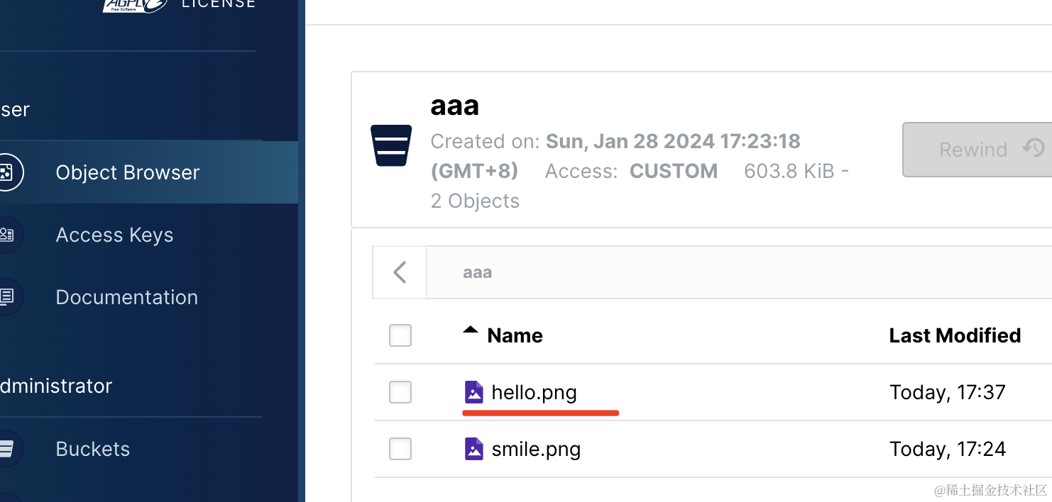 这个 bucket 就是管理桶的地方,而 object browser 就是管理文件列表的地方。