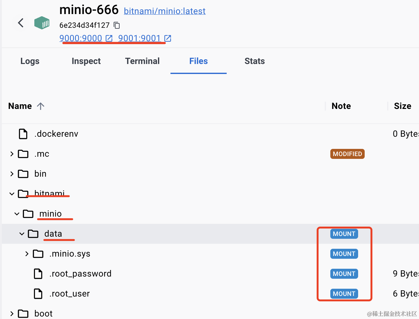 点击 run,跑起来之后可以看到数据目录被标记为 mounted,端口也映射成功了: