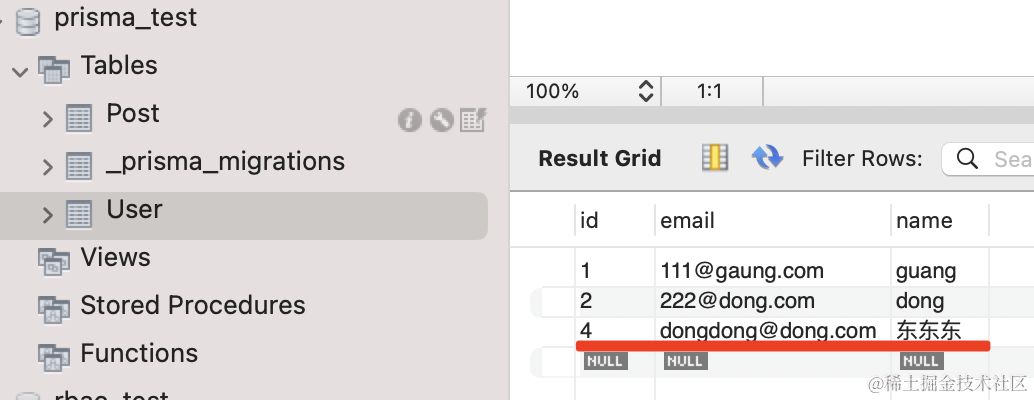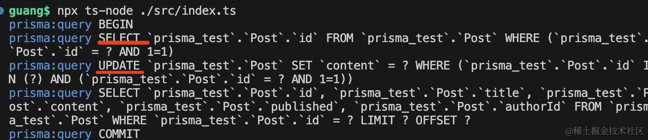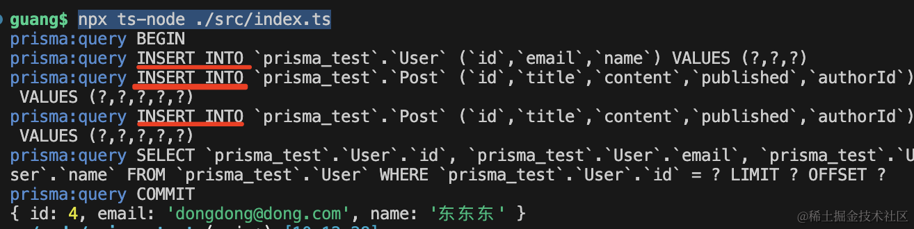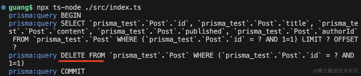 test2();这里开启了 prisma 的 log,会打印 sql。