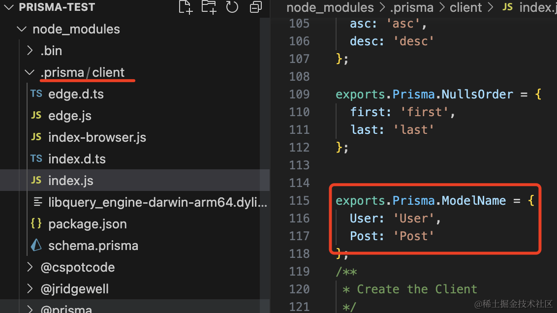 在 node_modules/.prisma/client 下生成的代码也包含了 user 和 post 的信息: