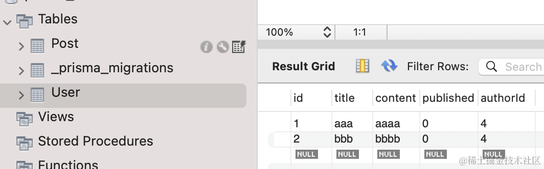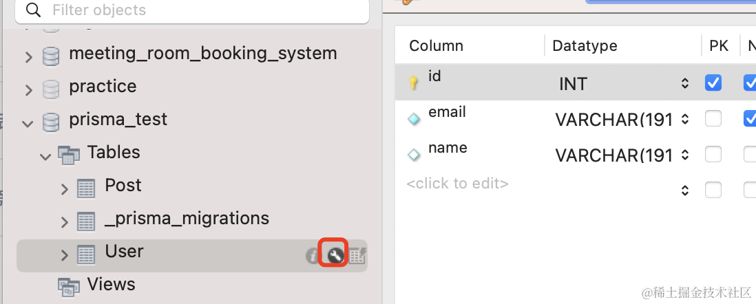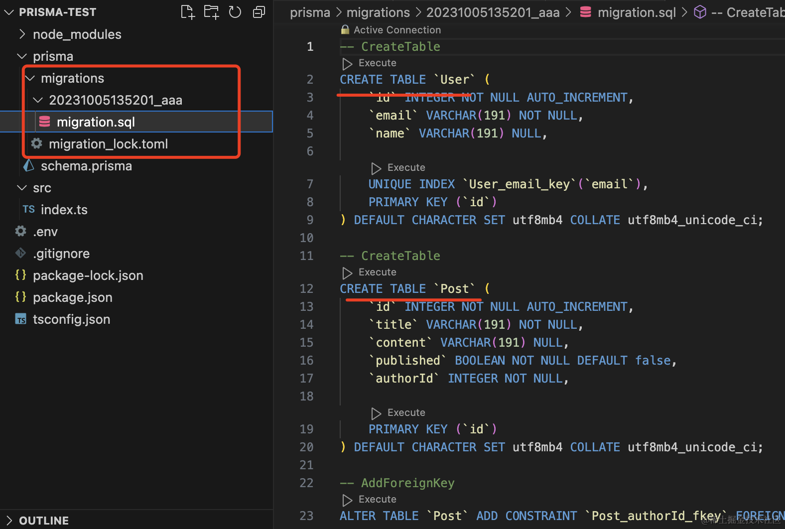 执行 prisma migrate dev,会生成并执行建表 sql 文件,而且在 node_modules 下生成了 client 代码。