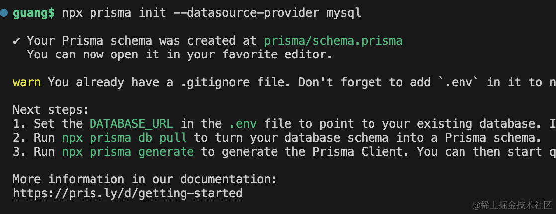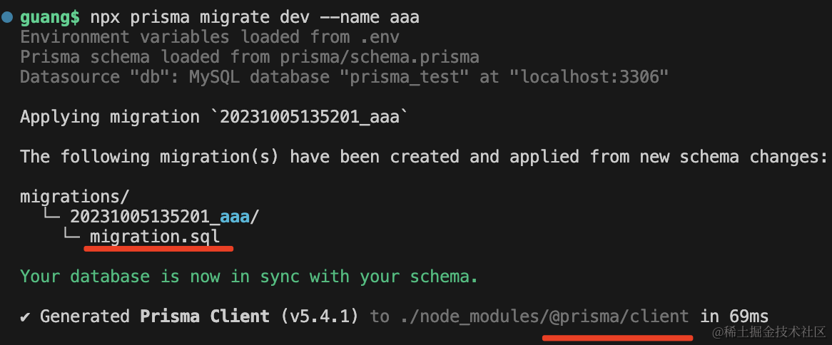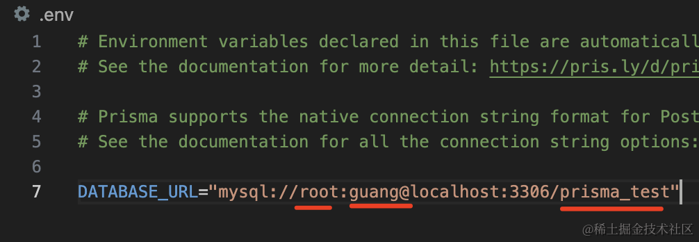 DATABASE_URL="mysql://root:guang@localhost:3306/prisma_test"改下用户名、密码、连接的数据库。